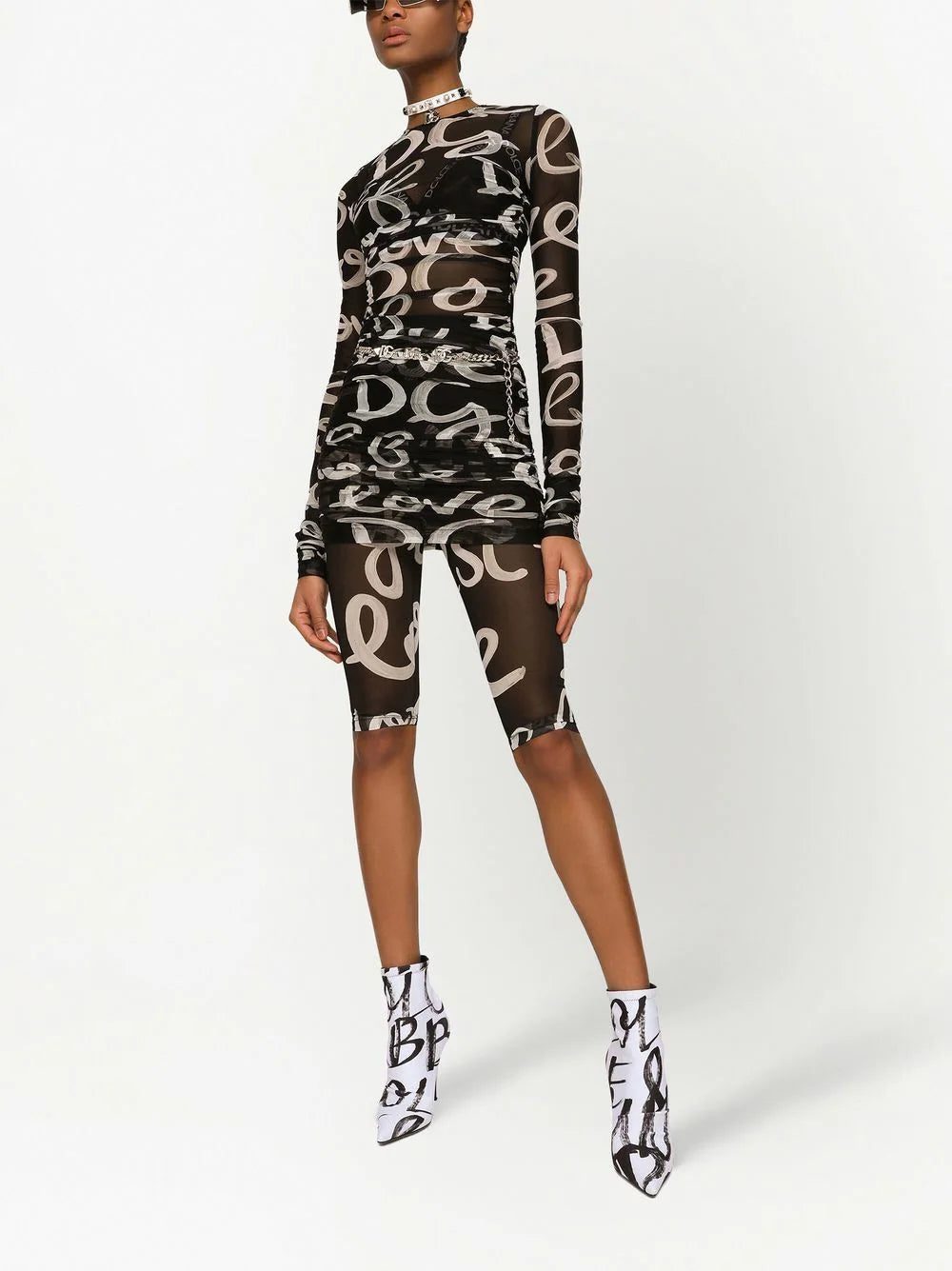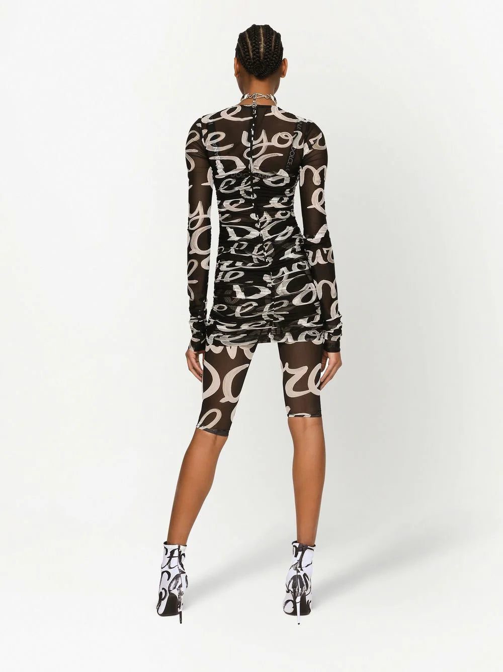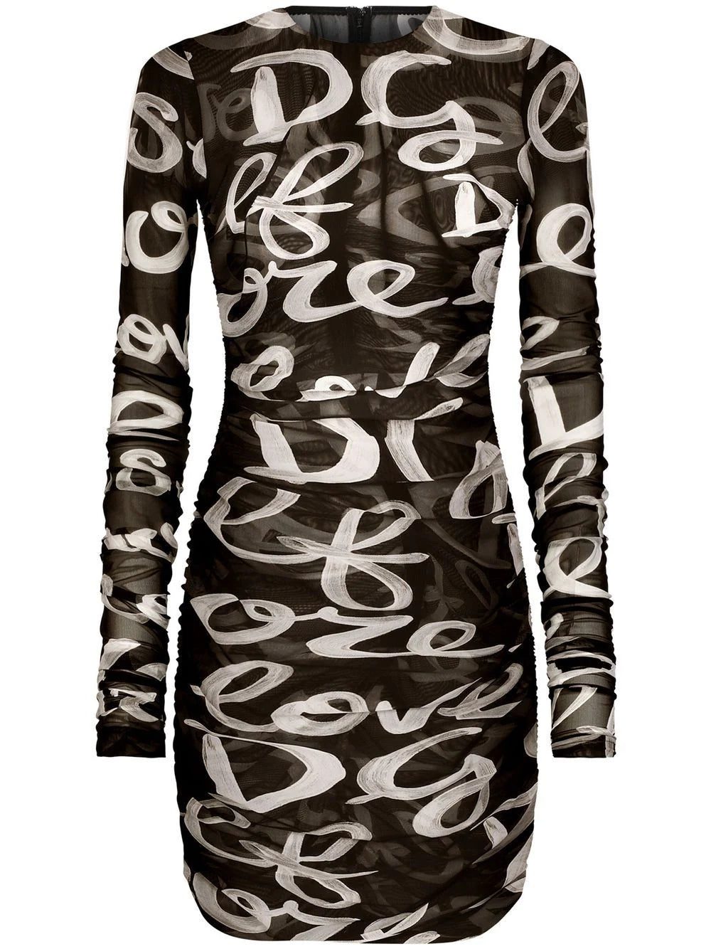 logo-print semi-sheer mini dress from DOLCE & GABBANA featuring black/white, all-over logo print, semi-sheer overlay, ruched detailing, stretch-design, round neck, long sleeves and straight hem.