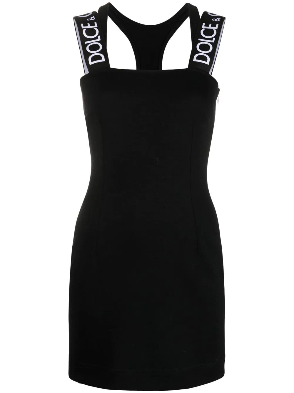 logo-strap detail mini dress from DOLCE & GABBANA featuring logo shoulder strap, sleeveless, jet black, virgin wool, stretch-design and short length.