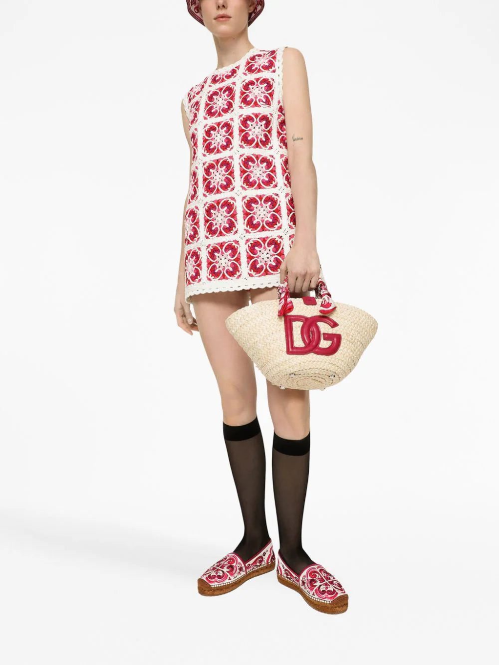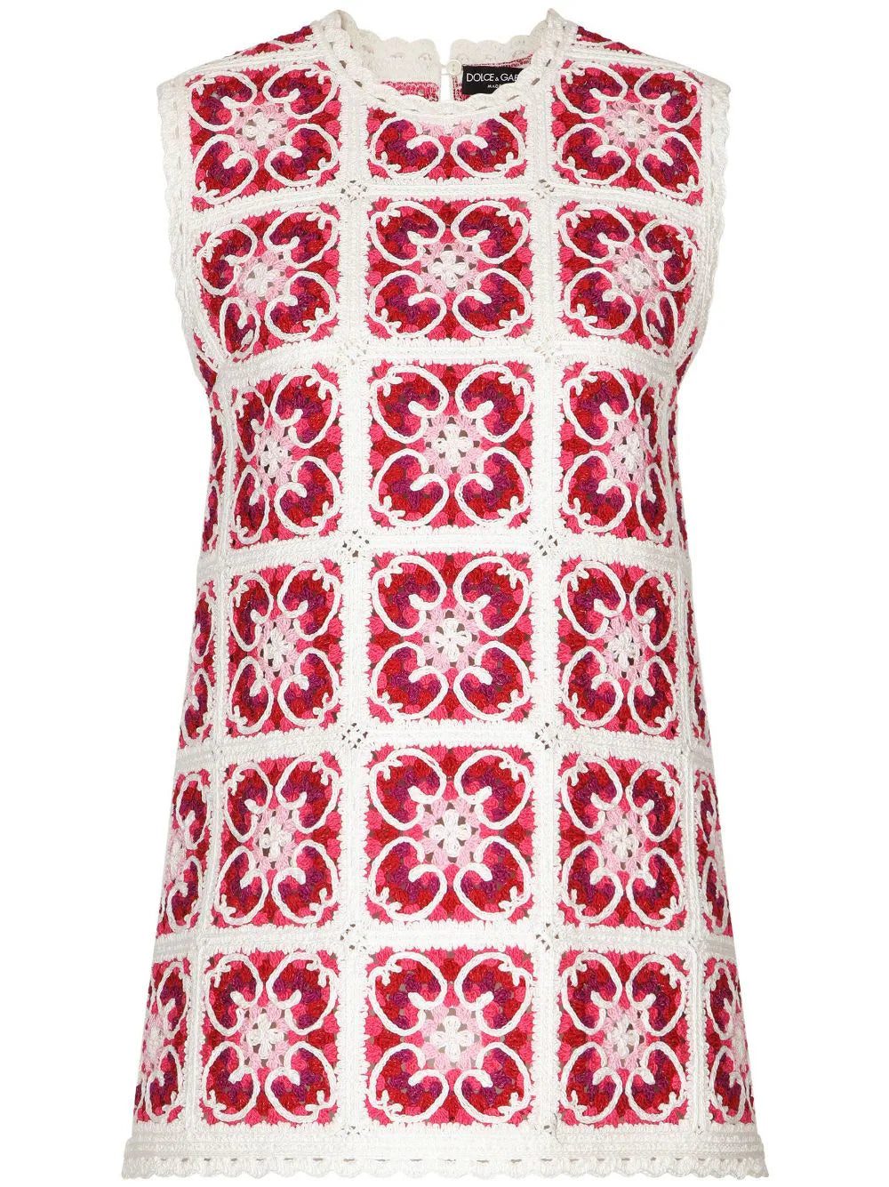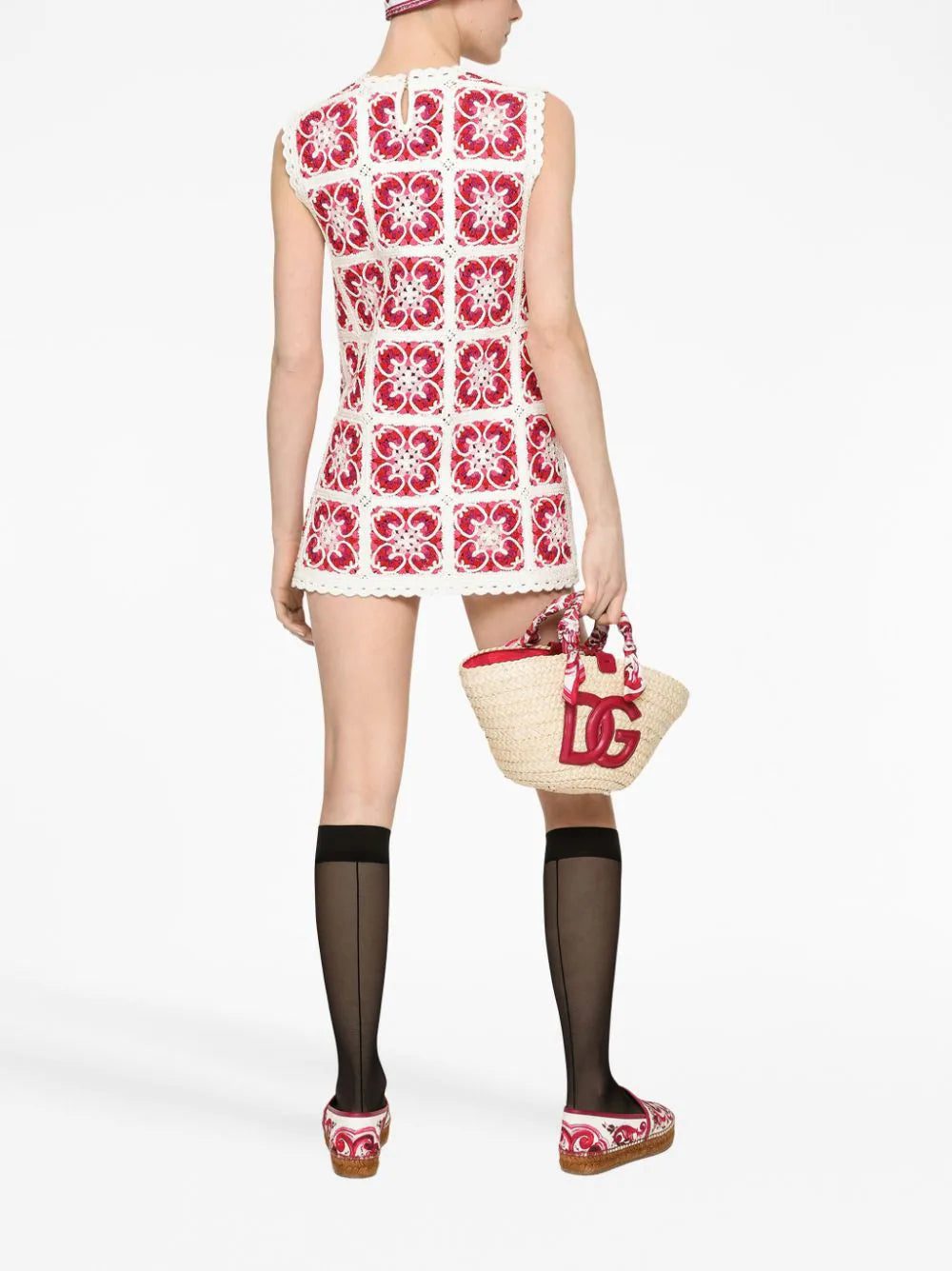 Dolce & Gabbana's penchant for bold motifs is showcased in this minidress from the AW23 collection. The focal point is the iconic Majolica motif – a house symbol honouring the founders' home country of Italy – in a red and white iteration, artfully crocheted-knitted into a simple A-line silhouette reminiscent of sixties styles.