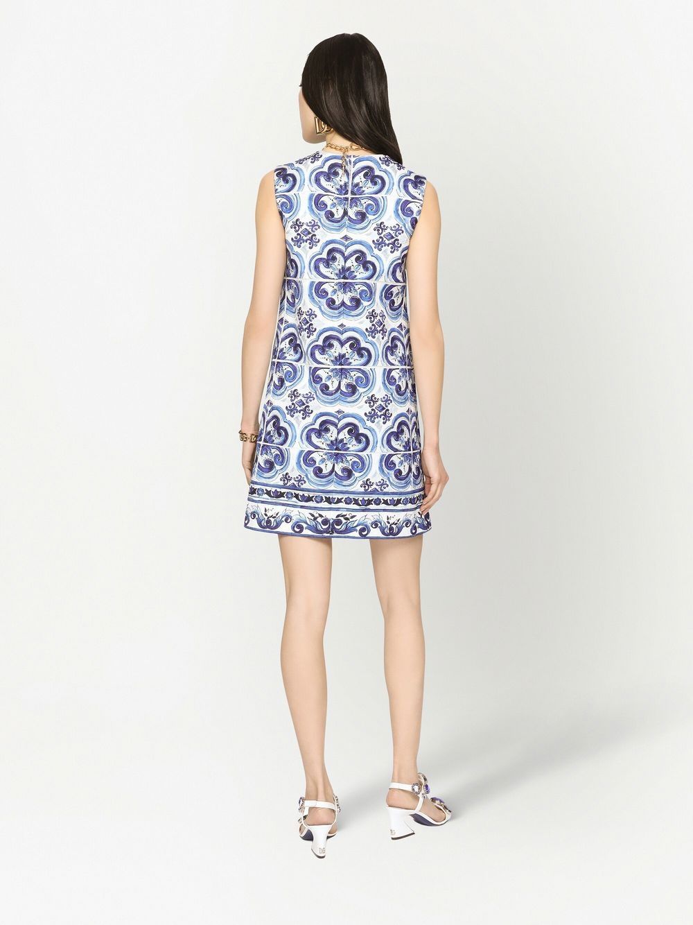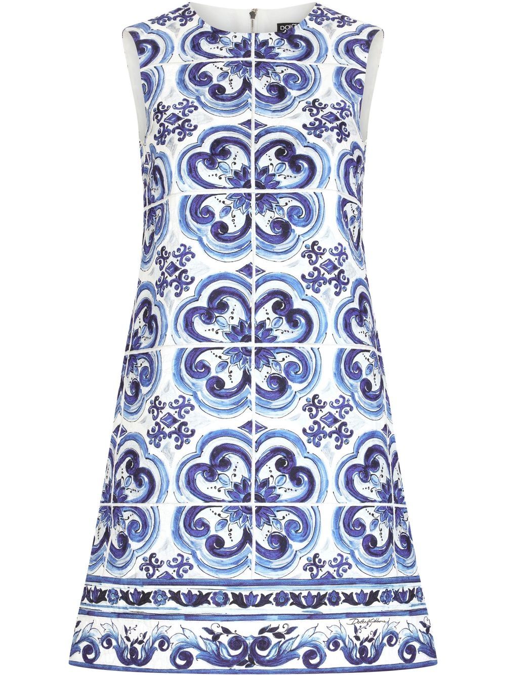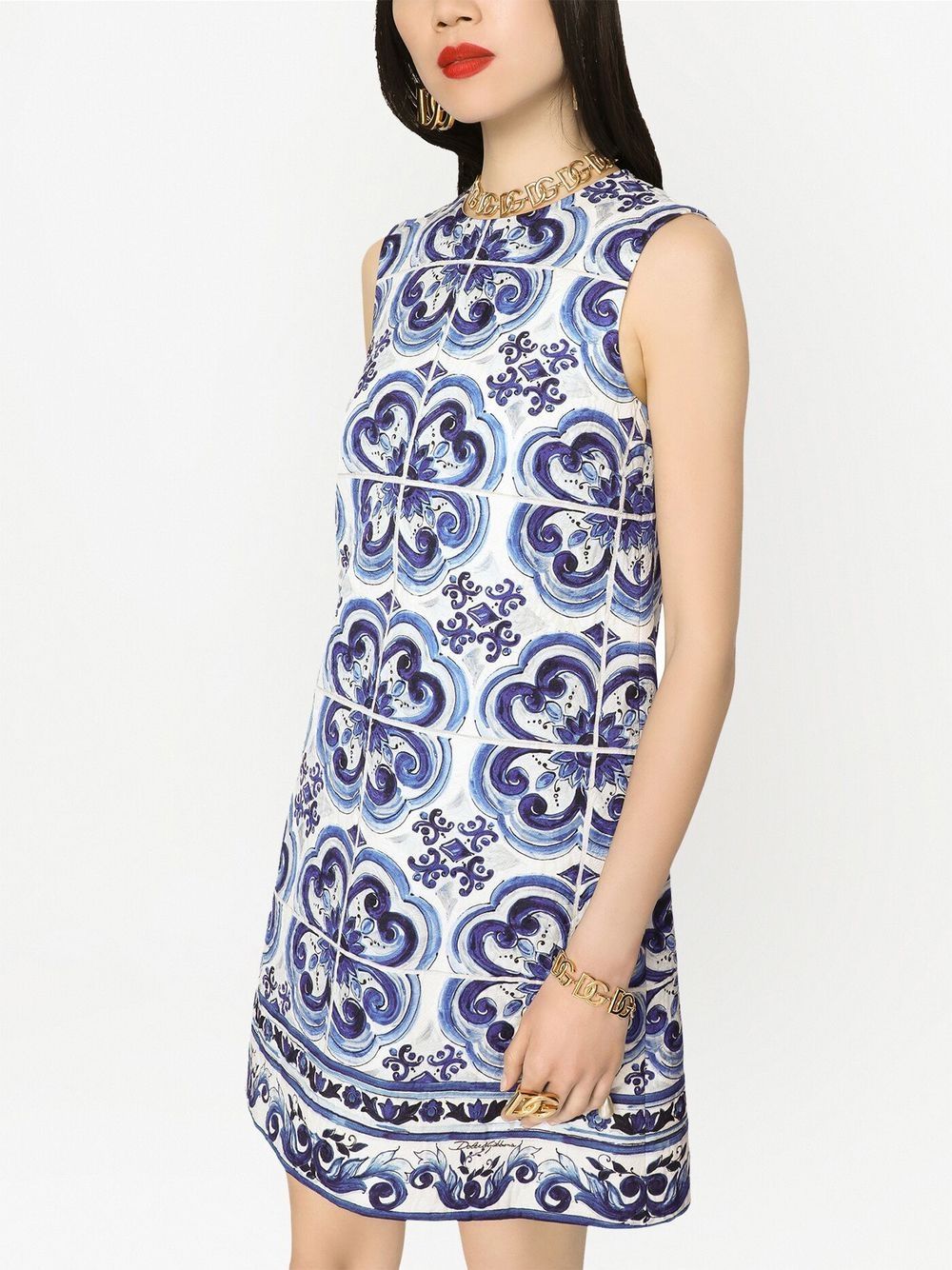 Majolica-print shift mini dress from DOLCE & GABBANA featuring navy blue, blue, white, stretch-silk, cotton blend, Majolica print, round neck, concealed rear zip fastening, sleeveless, shift style and straight hem.