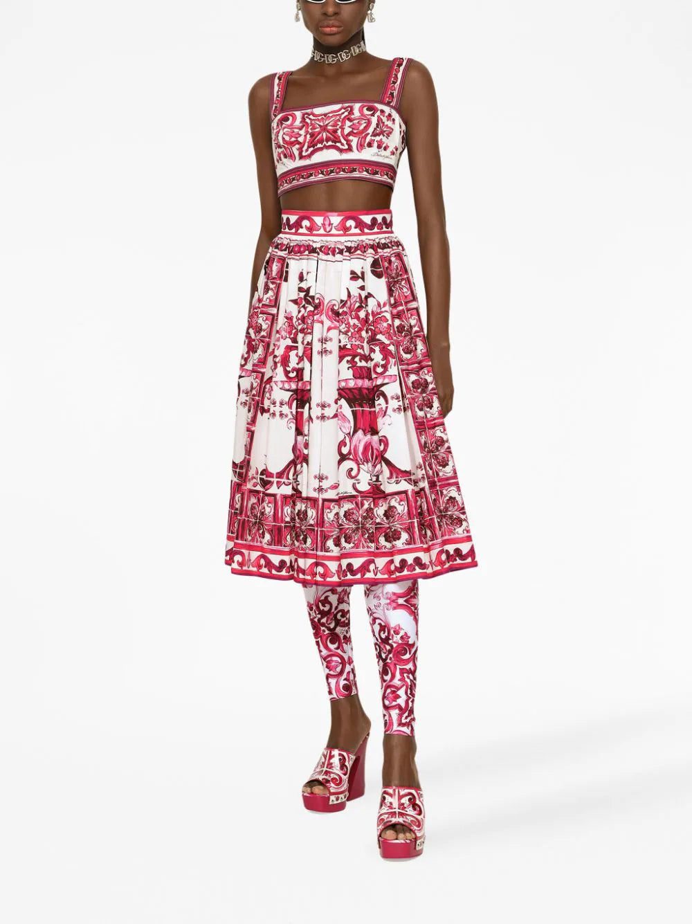Dolce & Gabbana’s cotton crop top is saturated with the brand’s signature Majolica print. Updated in a red and white palette, the striking design takes cues from the artwork seen on traditional Mediterranean pottery.