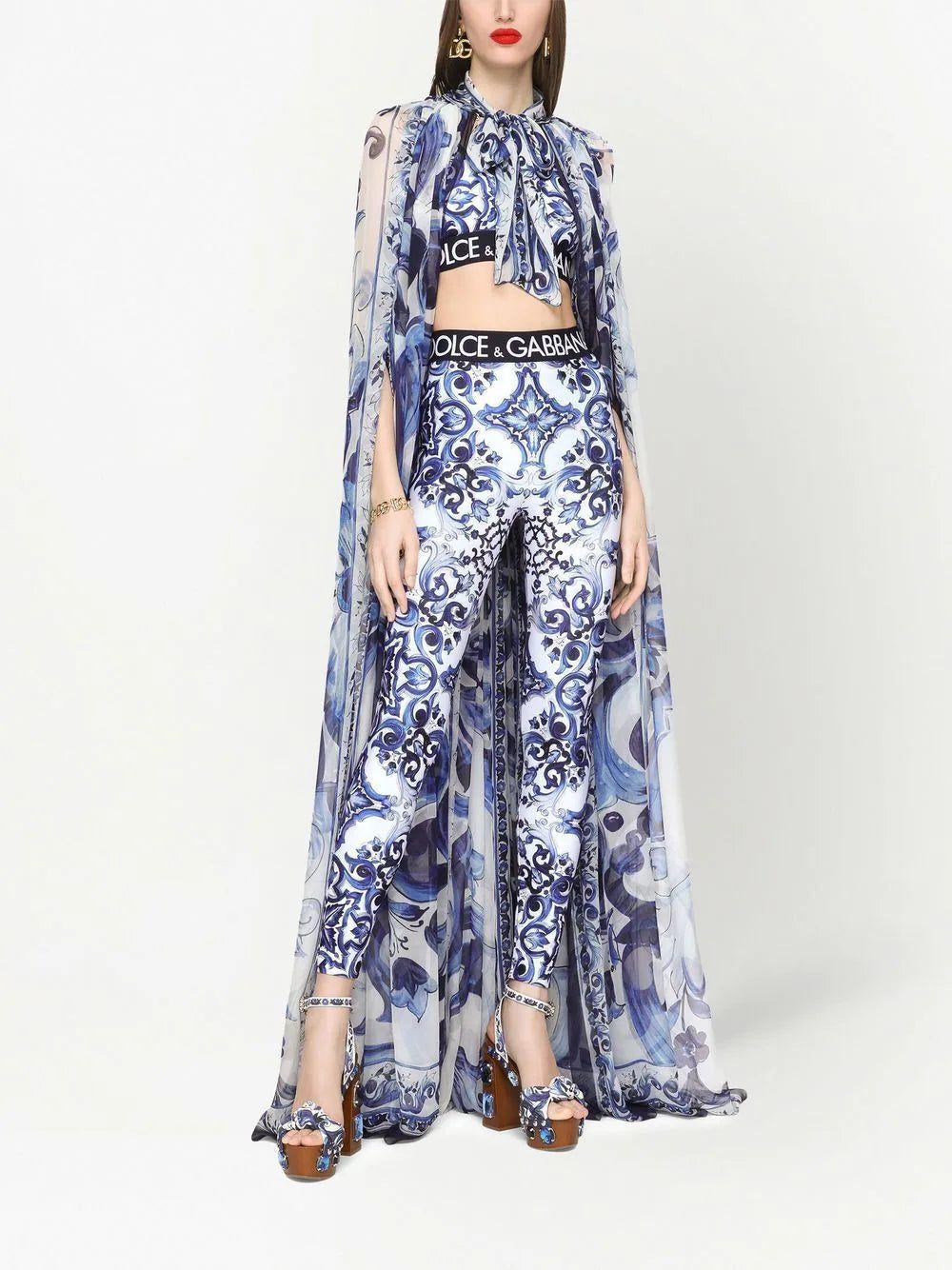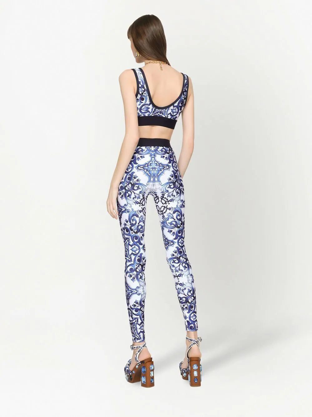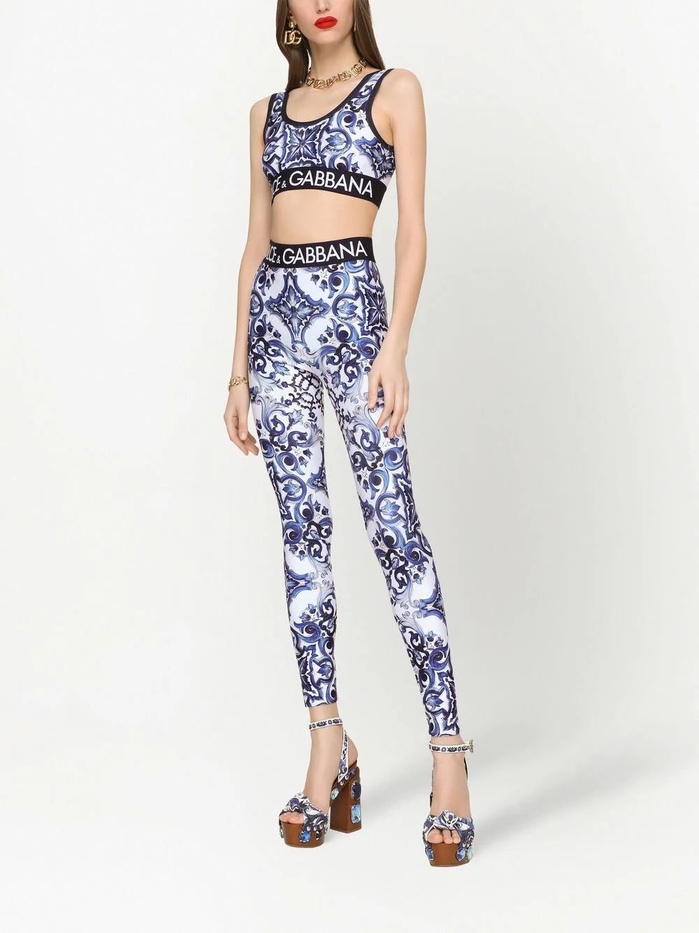 Majolica-print cropped top from DOLCE & GABBANA featuring navy blue, blue, white, Majolica print, plunging U-neck, sleeveless, logo waistband and cropped.