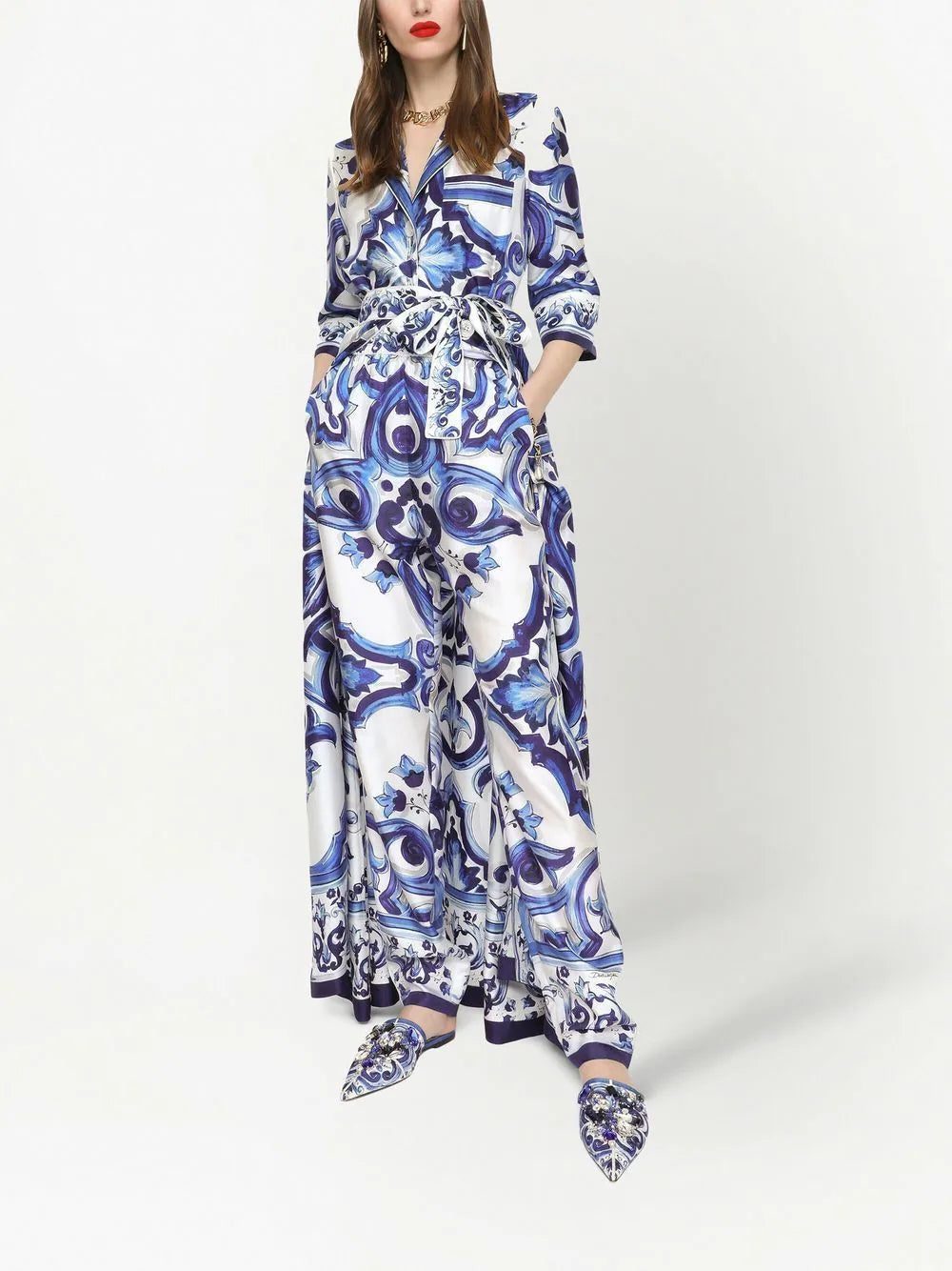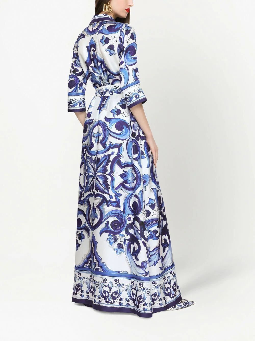 Majolica-print maxi shirt dress from DOLCE & GABBANA featuring navy blue, blue, white, silk, Majolica print, spread collar, front button fastening, three-quarter length sleeves, tied waist and long length.