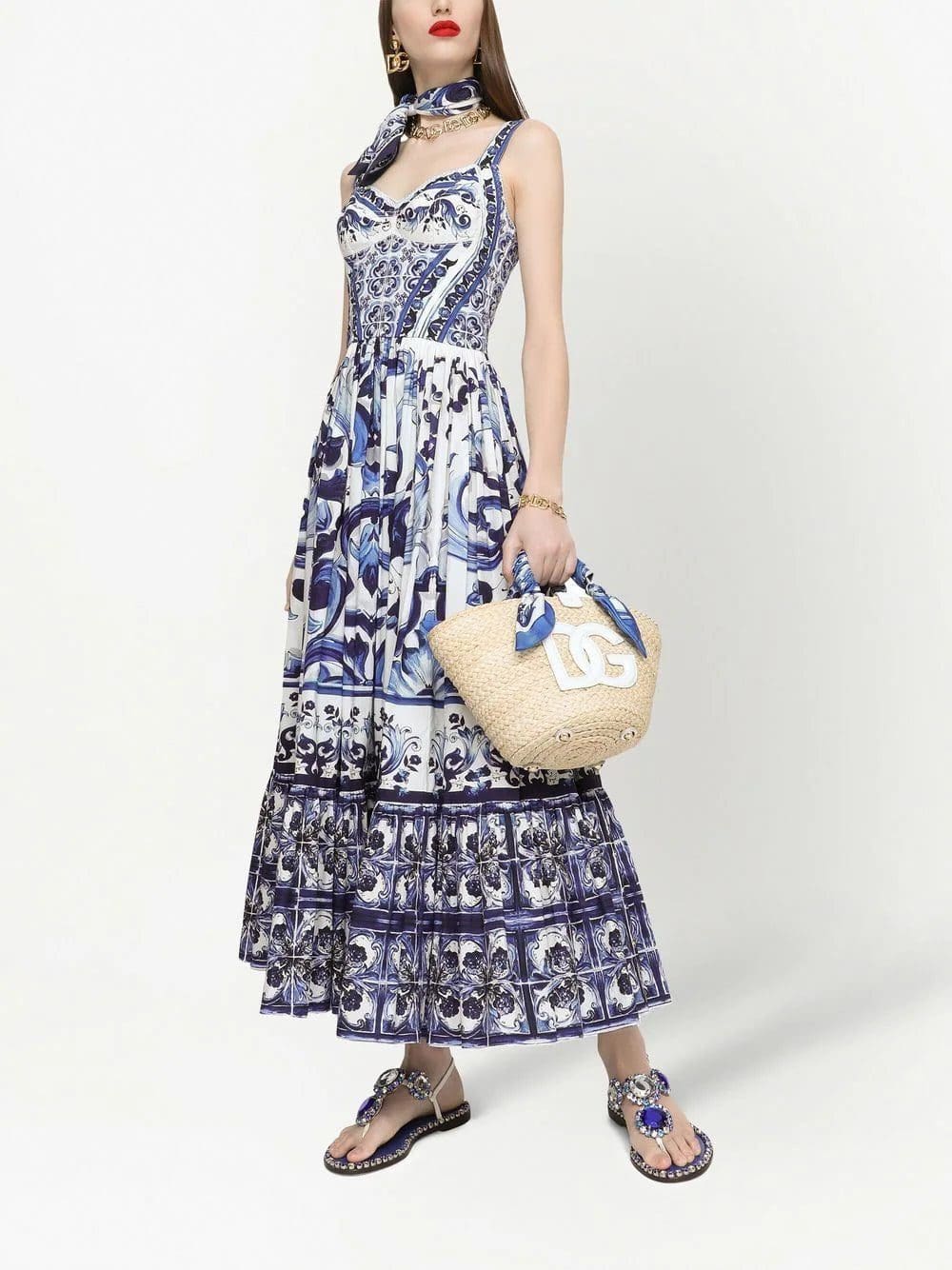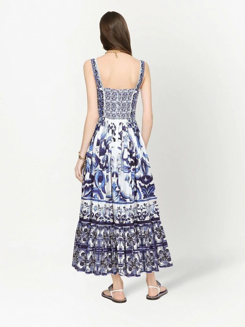 Defined by a white and blue Majolica print, this midi dress shows DOLCE & GABBANA's bold Sicilian-inspired style. Its design is crafted from soft cotton and features a relaxed cut enhanced with a sweetheart's neck.