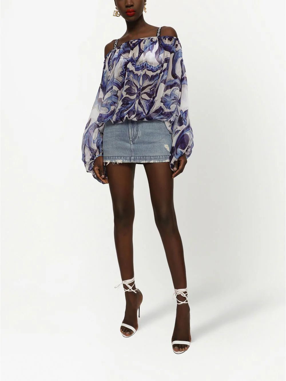 Majolica-print off-shoulder blouse from DOLCE & GABBANA featuring blue, white, silk, chiffon, semi-sheer construction, elasticated trim, Majolica print, off-shoulder, long sleeves and balloon sleeves.