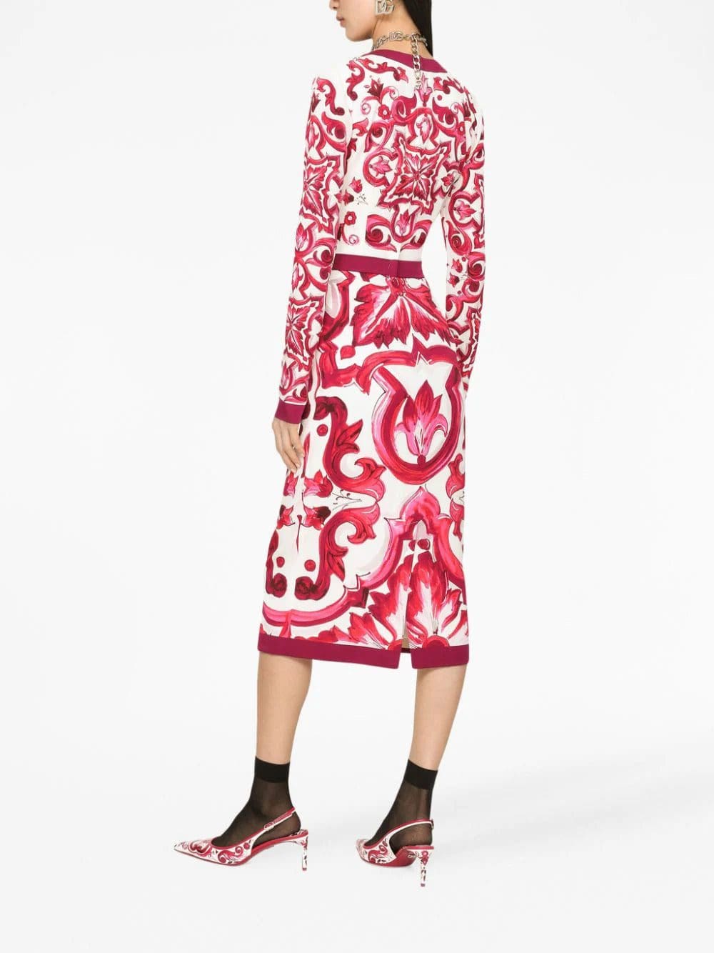 This midi fitted dress from Dolce & Gabbana's AW23 collection has the brand's signature Majolica design. The striking motif, inspired by the artwork seen on Mediterranean pottery, honors the house's Sicilian heritage.