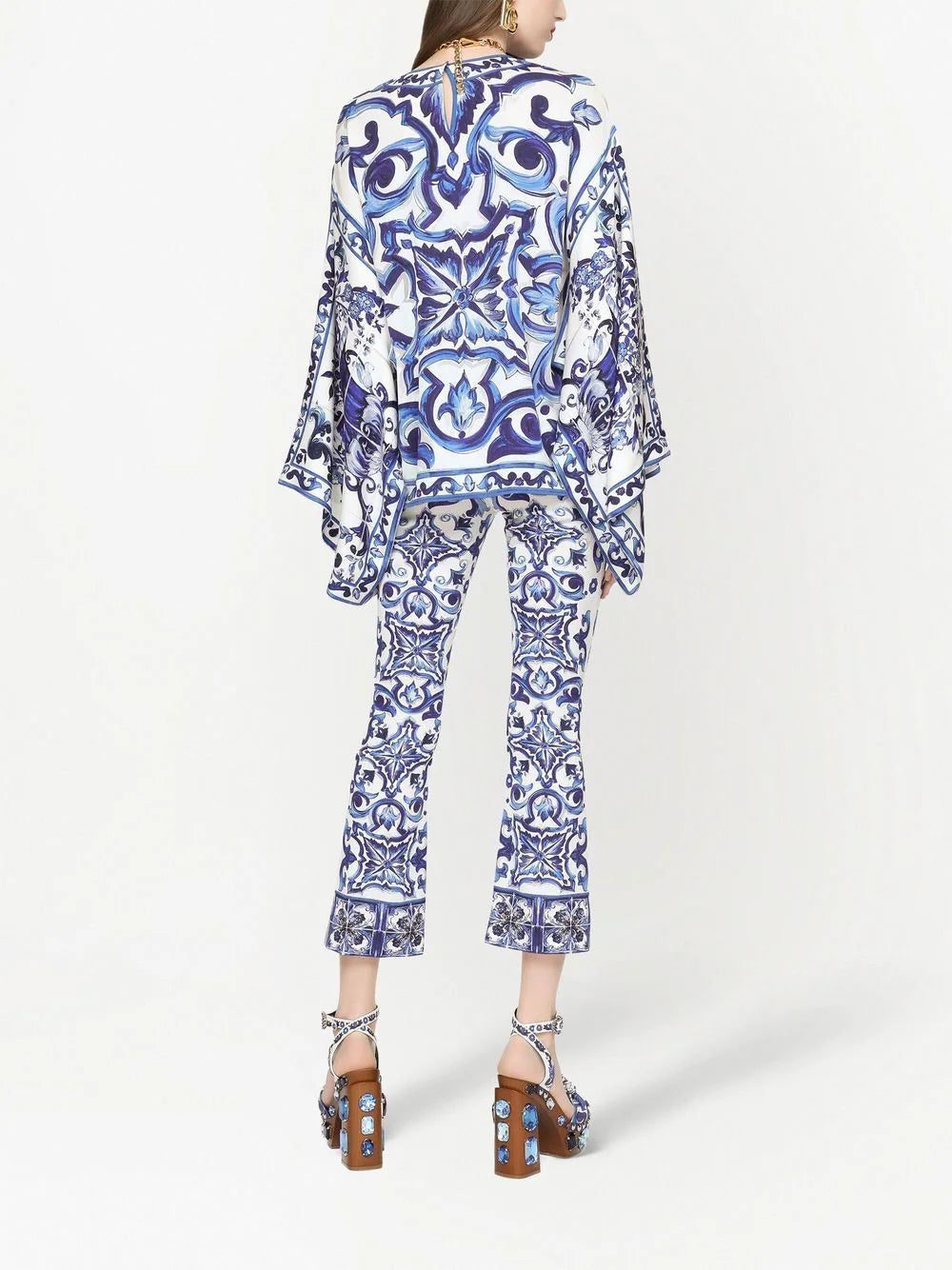 Majolica-print silk blouse from DOLCE & GABBANA featuring navy blue, blue, white, stretch-silk, Majolica print, round neck, batwing sleeves and straight hem.