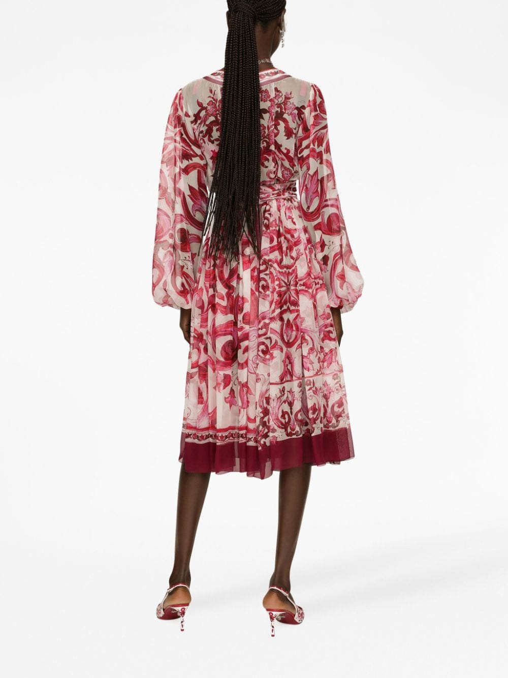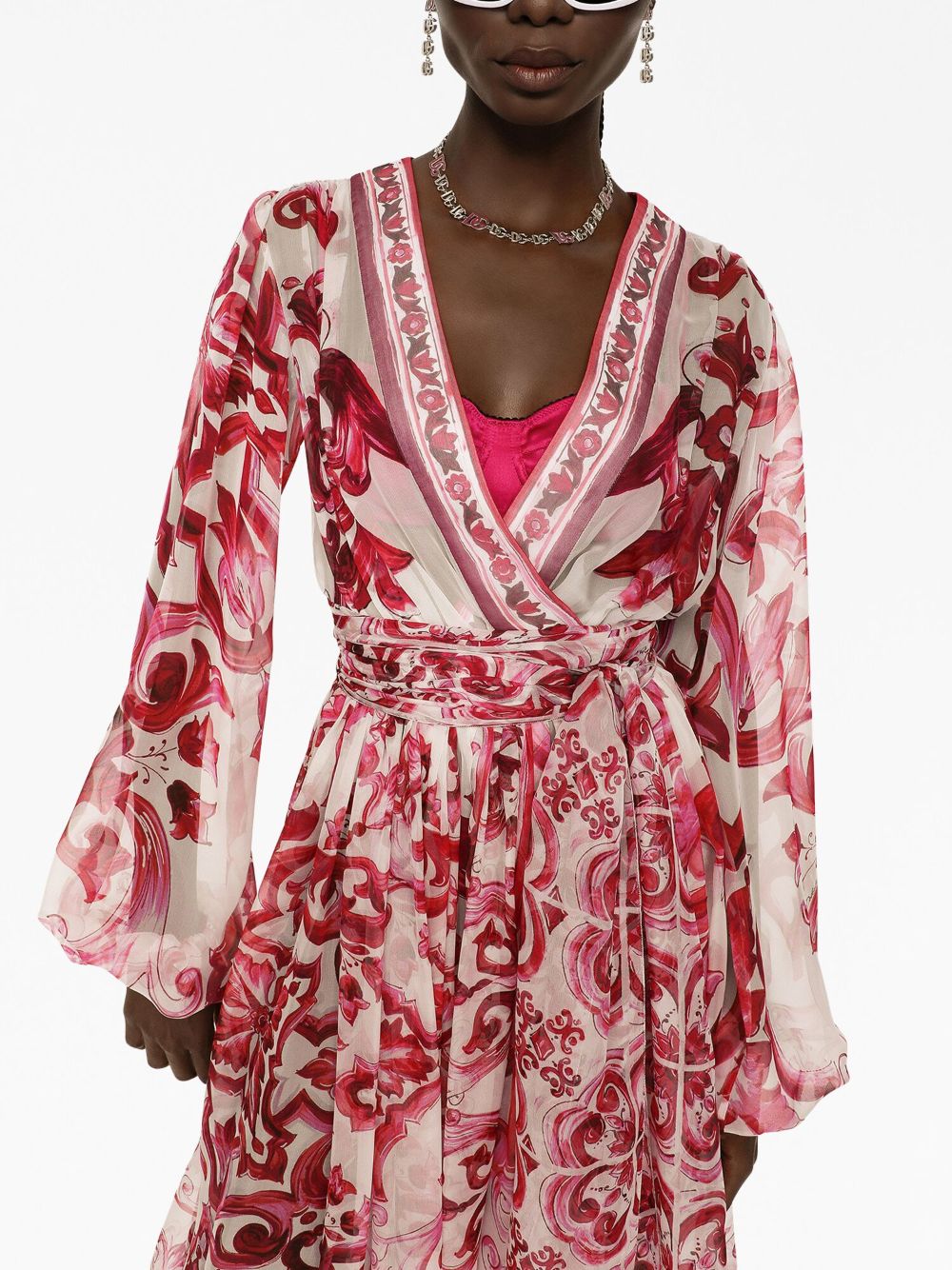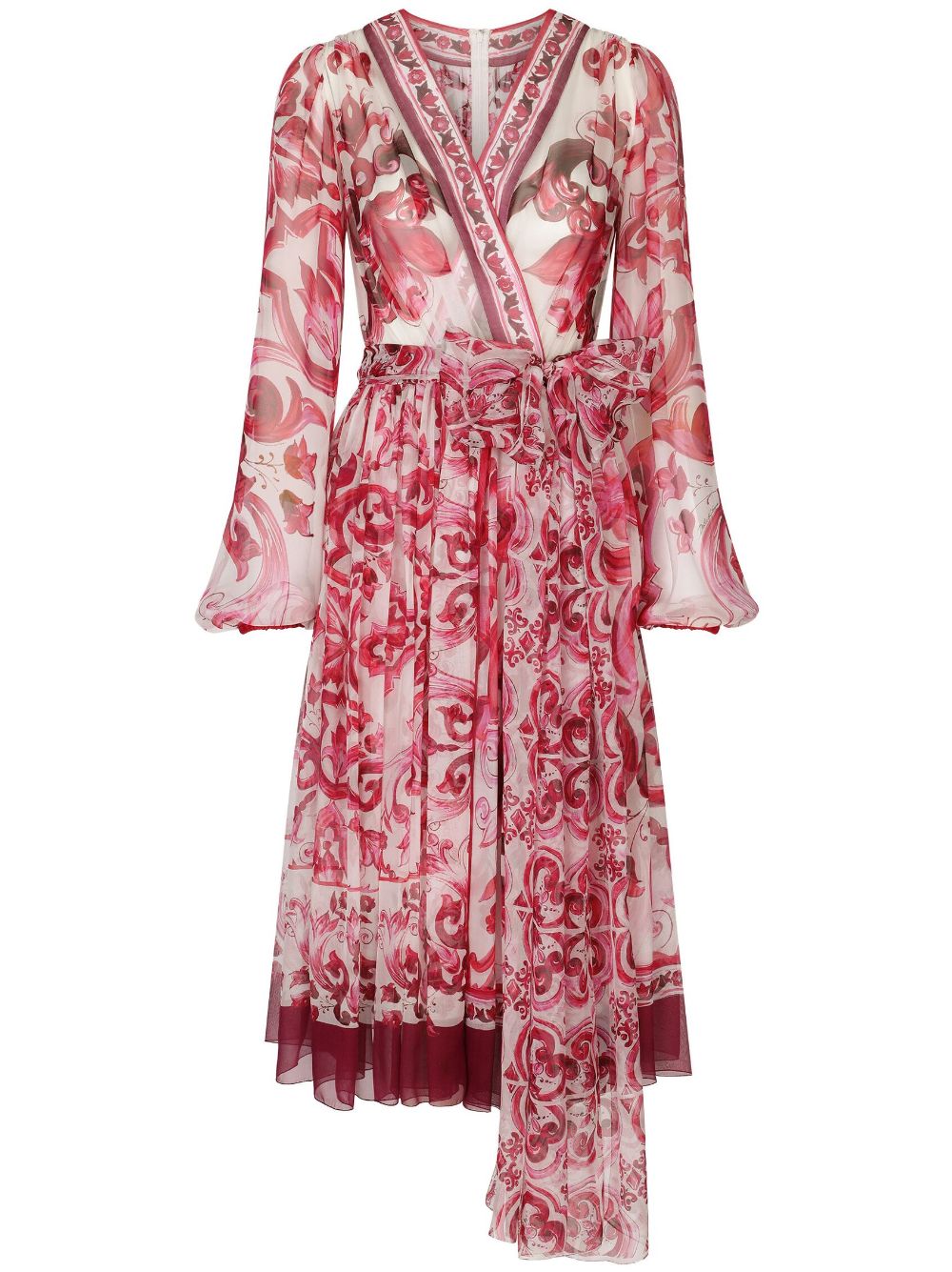 A key motif in Dolce & Gabbana's AW23 collection, the Majolica print is inspired by the pottery and tiles found in the Sicilian city of Caltagirone. It infuses this silk-chiffon midi dress with punchy colour, enlivening its wrap top and softly pleated skirt.