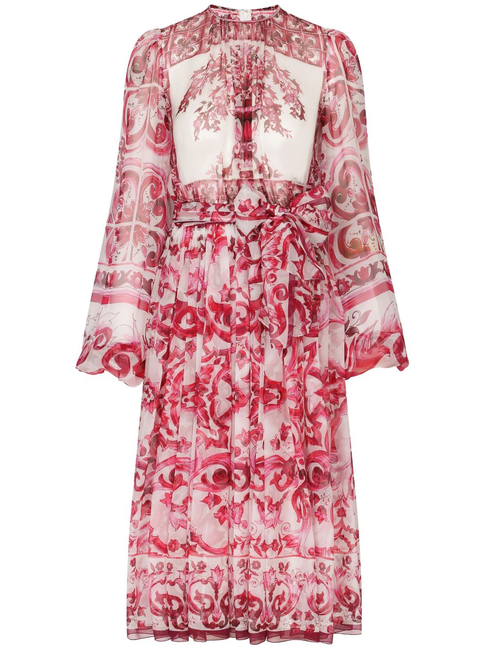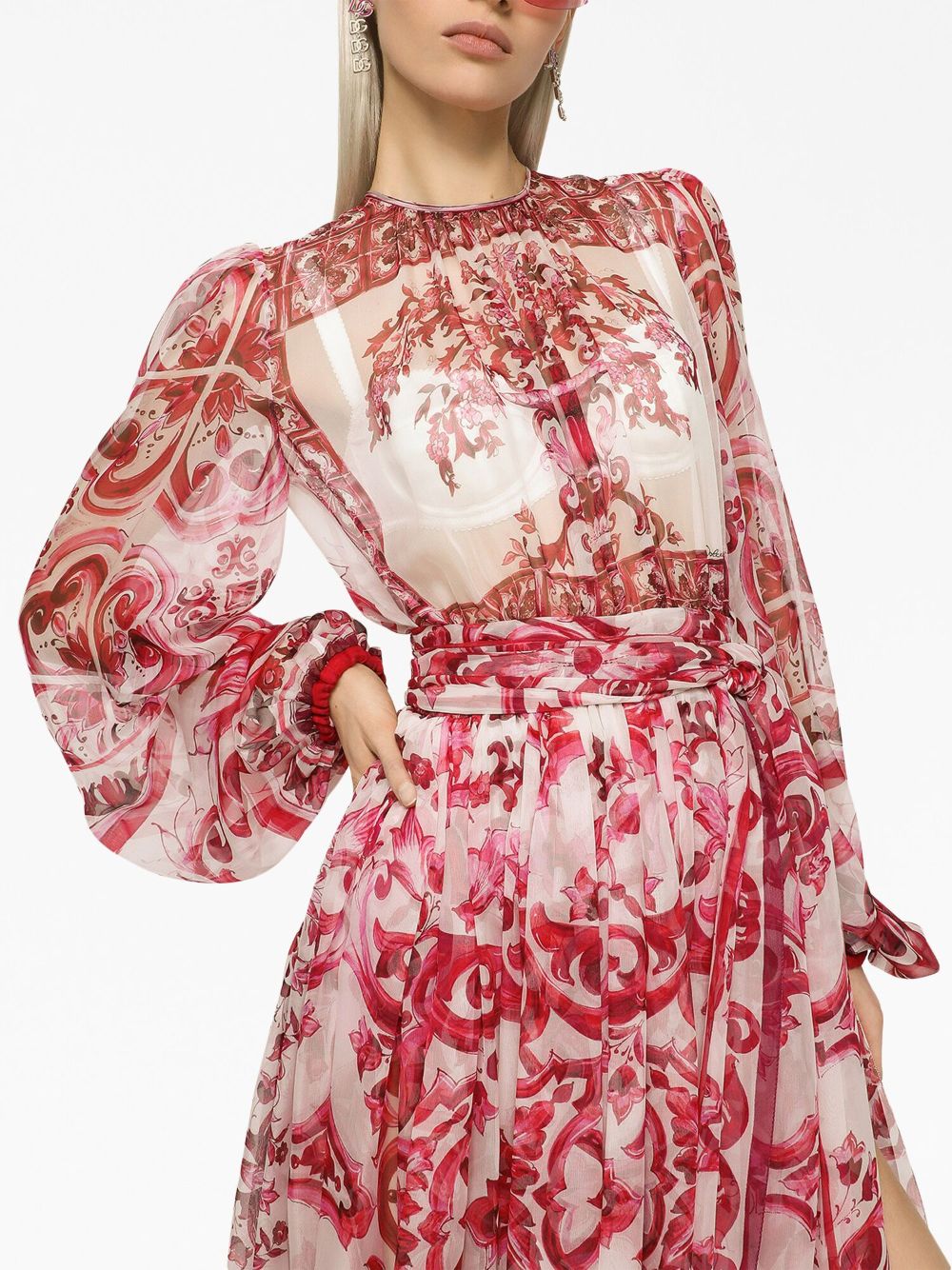 Dolce & Gabbana adorns this flowy midi dress with its signature Sicilian aesthetic. The long-sleeve garment is printed with the iconic Majolica pattern, showcasing an intricate mix of flowers and geometric motifs.