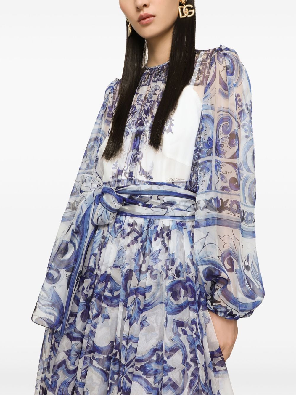 Conjuring up images of a Mediterranean lifestyle, this Dolce & Gabbana midi dress boasts a white silk-chiffon base saturated with a majolica print incorporating naturalistic, calligraphy-style motifs in a deep shade of blue. It's cut to a flared silhouette fitted with a waist belt.