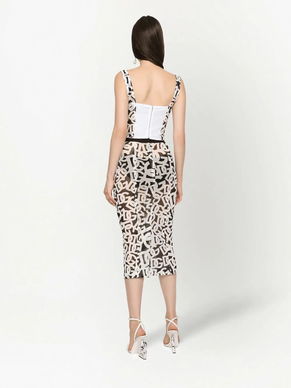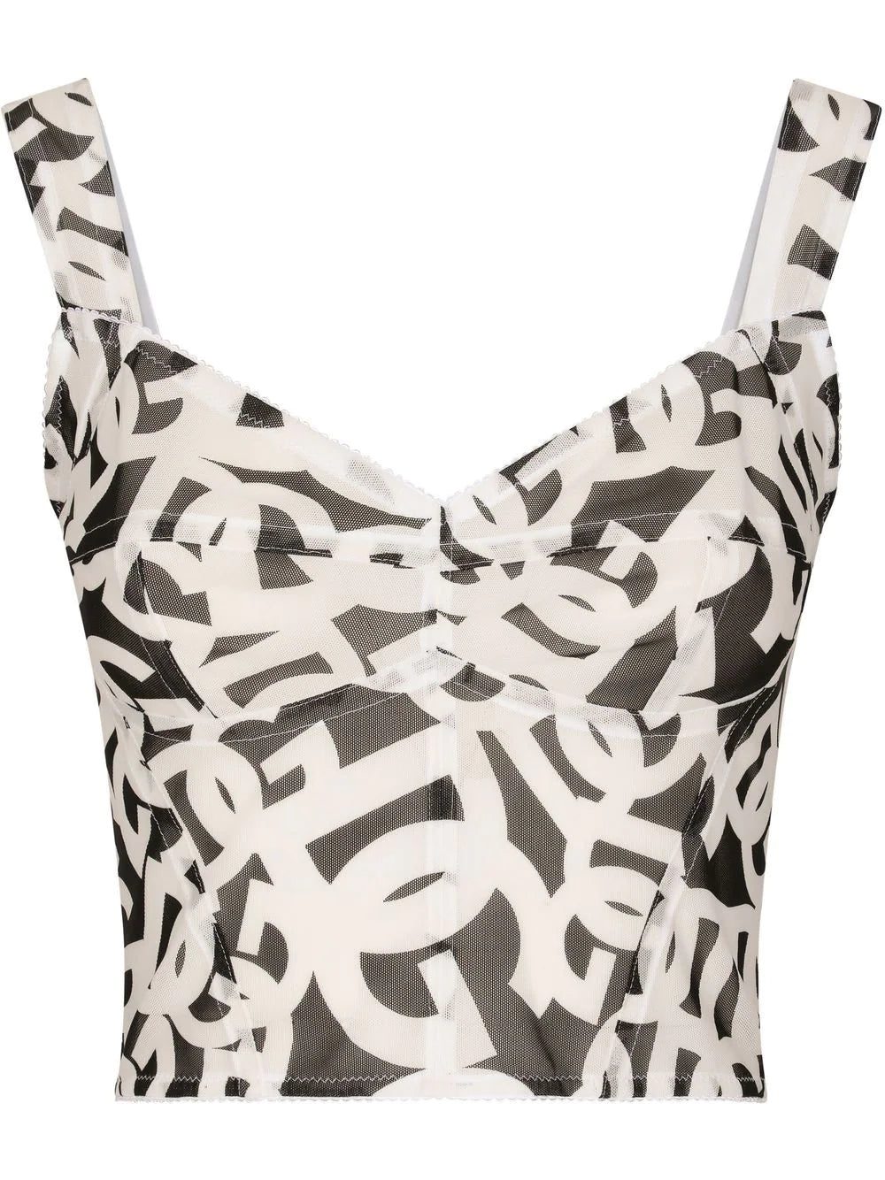 Marquisette logo-print top from DOLCE & GABBANA featuring white/black, monogram print, semi-sheer panels, bustier-style neckline, wide shoulder straps, rear zip fastening and bodycon design.