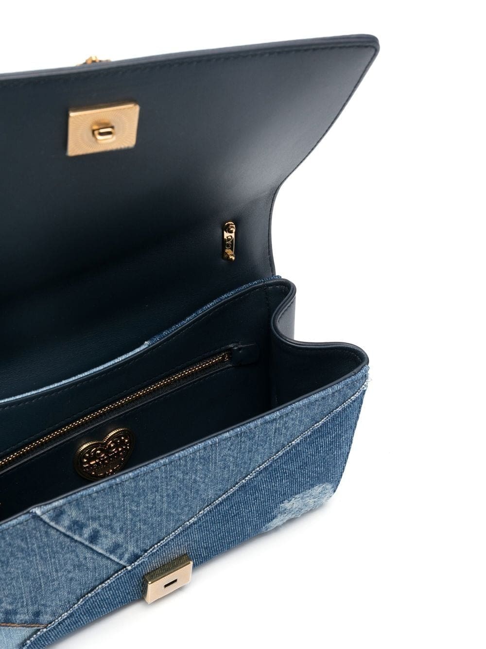 medium Devotion denim shoulder bag from DOLCE & GABBANA featuring blue, cotton, denim patchwork design, leather trim, gold-tone hardware, signature Sacred Heart plaque, main compartment, sliding chain-link shoulder strap, leather lining and foldover top with press-stud fastening. This piece comes complete with a protective dust bag..
