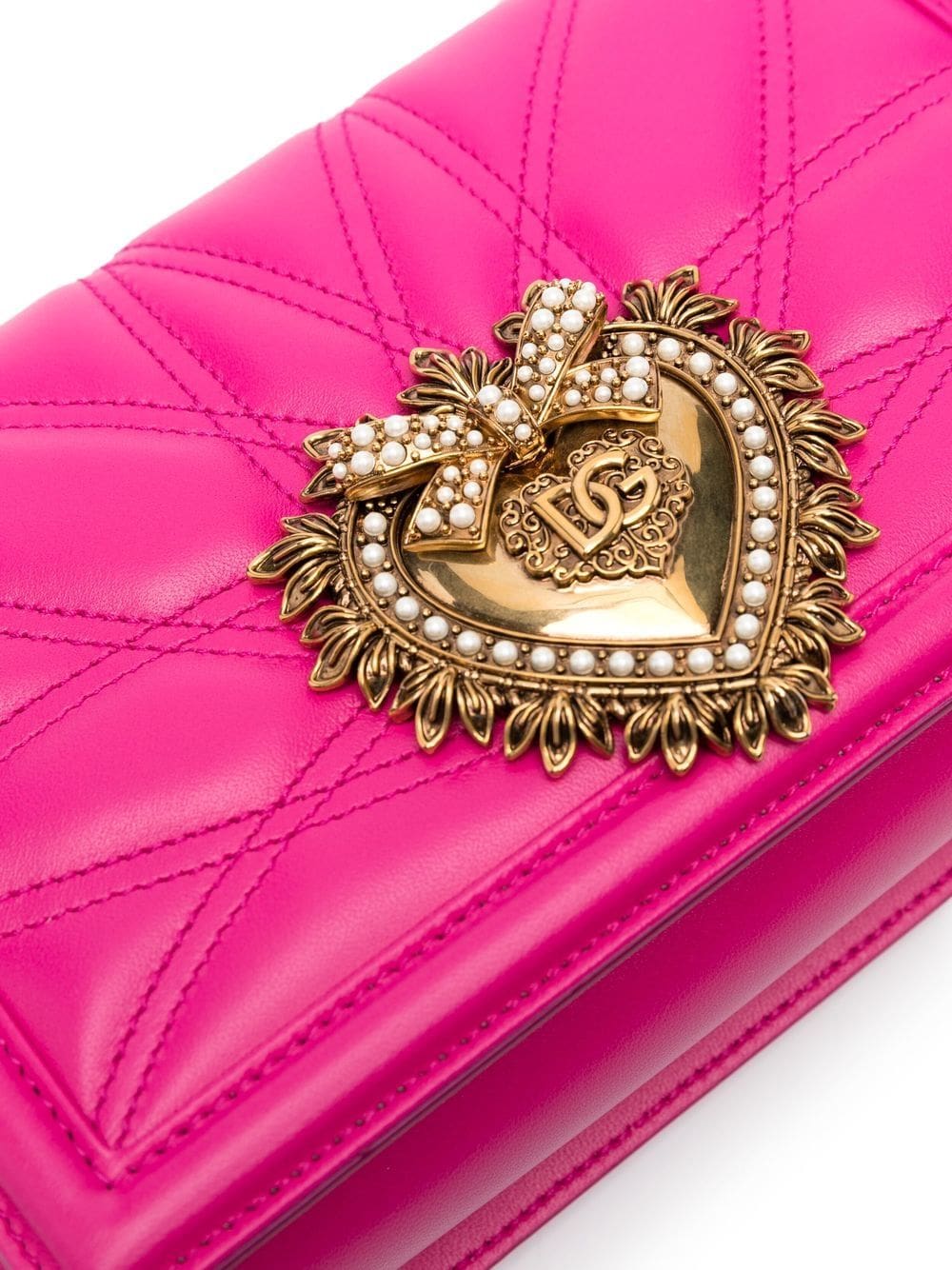 Dolce & Gabbana's aesthetic is the height of romanticism, as expressed through their trademark Sacred Heart motif that appears emblazoned across ready-to-wear and accessories for countless seasons. It decorates the front of this pink Devotion shoulder bag for AW23.