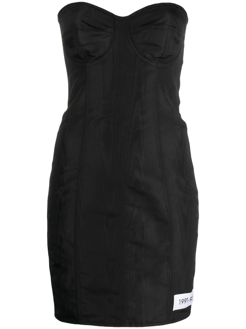 Reworked from the '90s, Dolce & Gabbana’s SS23 collection was in the hands of Kim Kardashian as curator, bringing forth their signature style. Originally designed in 1991, this black minidress is updated with a sweetheart neck in a glossy moiré faille silk fabric.
