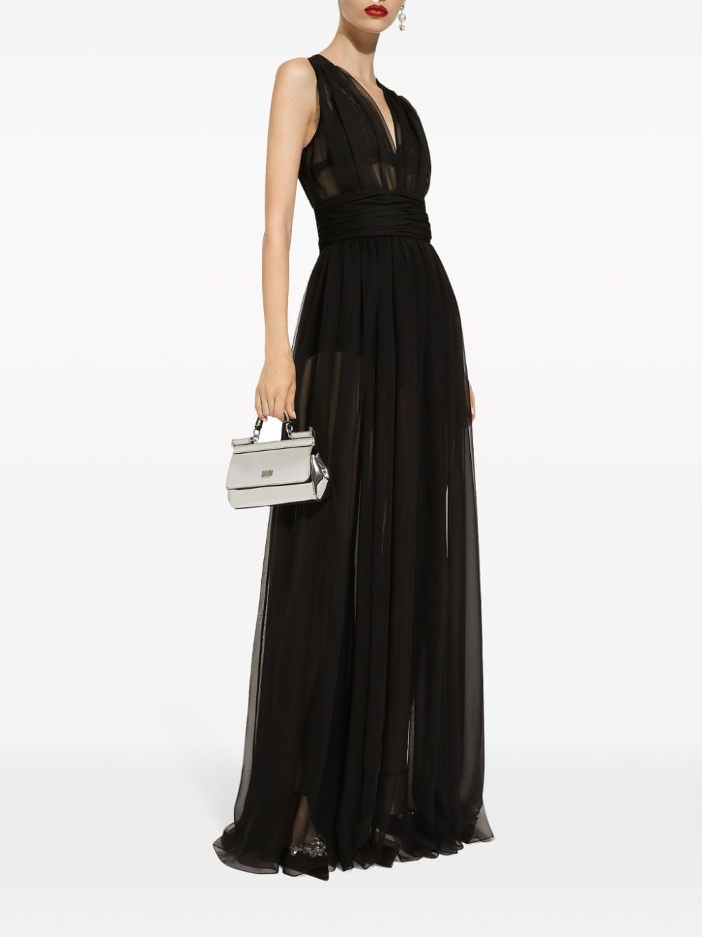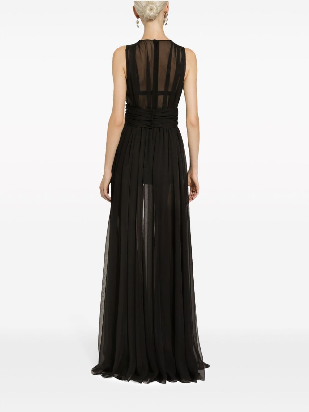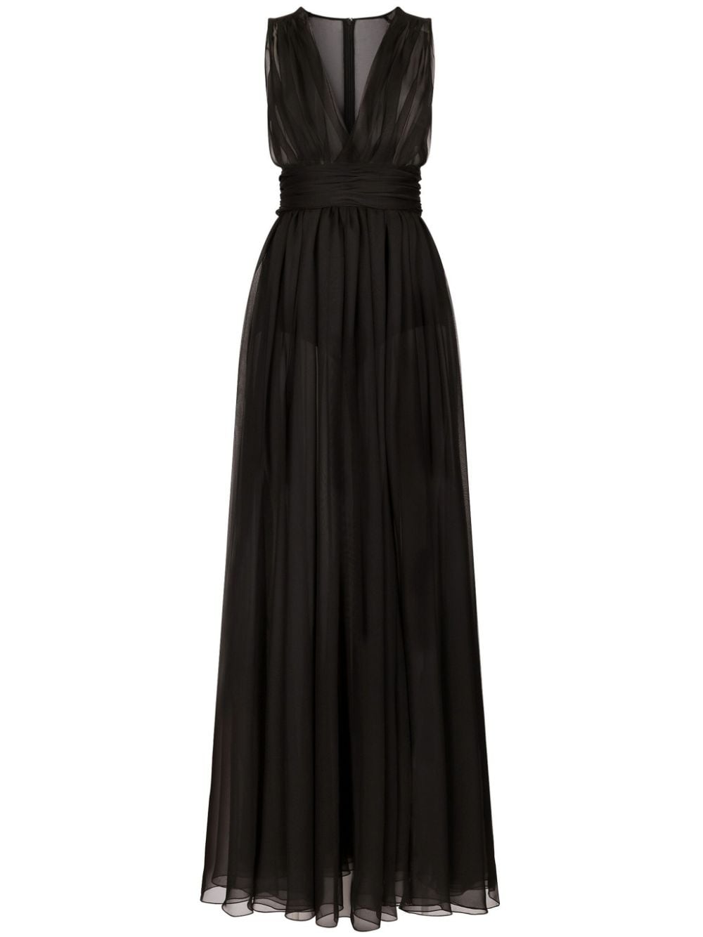 Dolce & Gabbana's SS24 collection displays a 'commitment to celebrating women in all their glory' with predominantly black looks inspired by lingerie. A testament to that theme - this black gown is crafted from pleated semi-sheer fabric into an exquisite floor length.