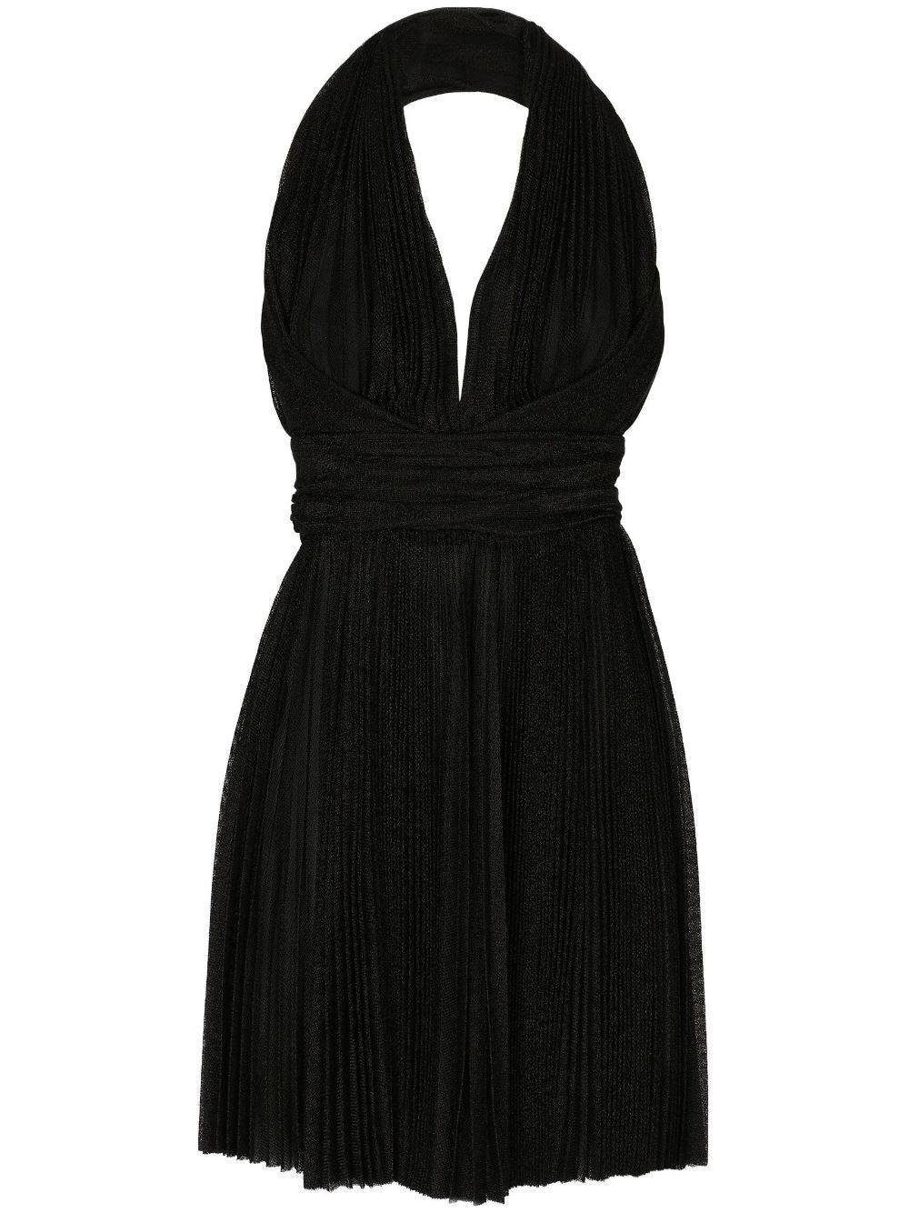 Crafted in Italy for an intricately plissé construction, this black minidress from Dolced & Gabbana boasts a halterneck that leads to cross-over straps at the rear and a plunging V-shaped neckline. Cinched at the waist for a defined silhouette, it falls to a flowy flared skirt.