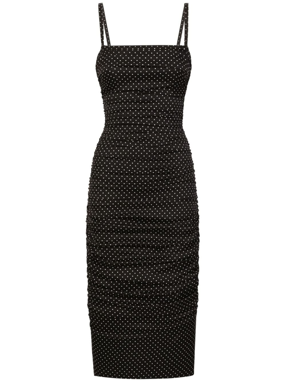 This black dress from Dolce & Gabbana is inspired by Hollywood glamour. It is made from black stretch silk to a ruched silhouette and embellished with a micro polka dot print for a subtly dramatic look.