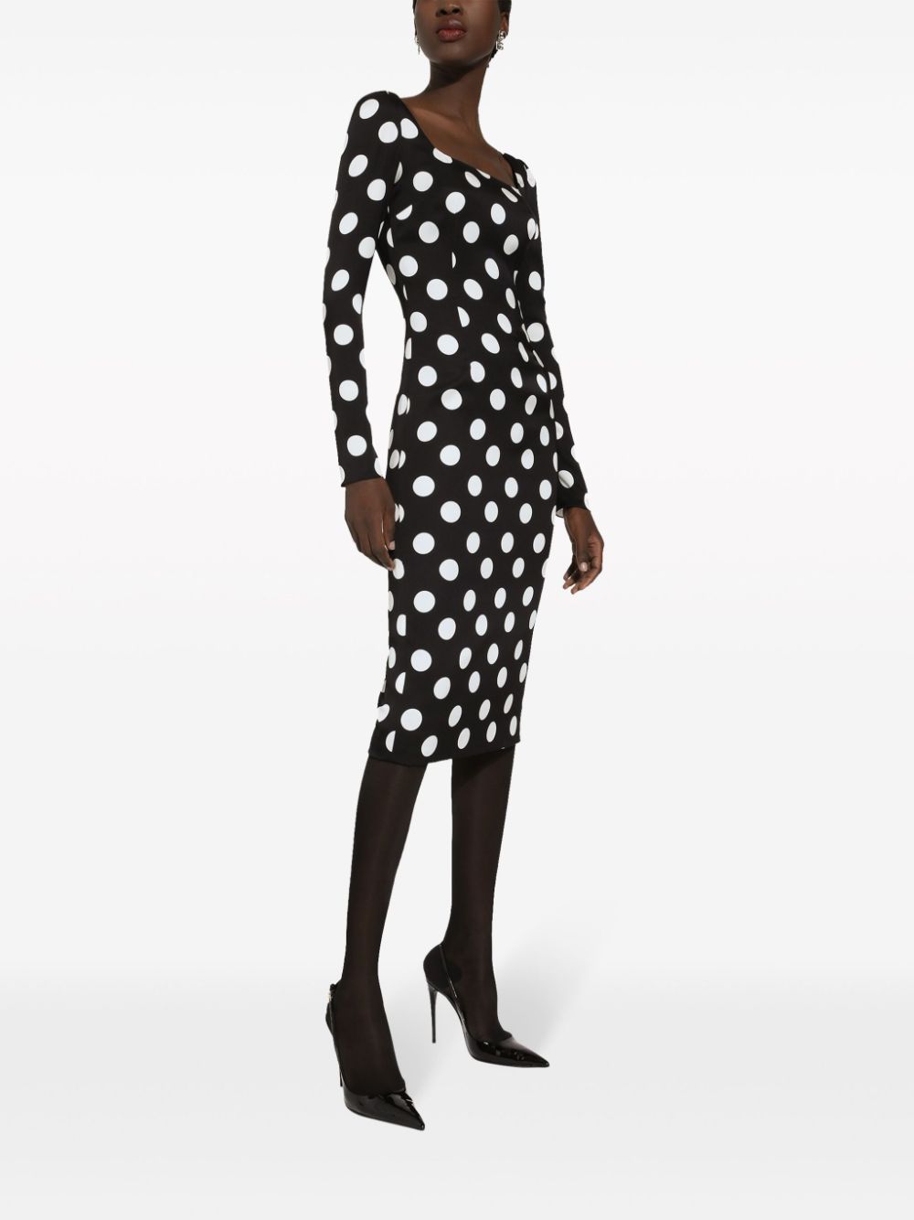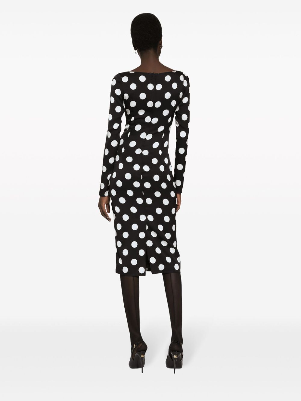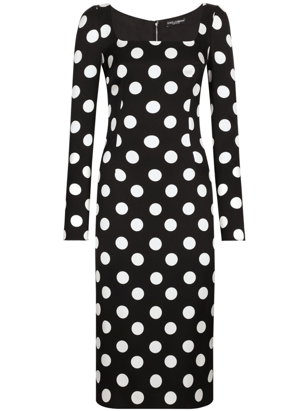 Dolce & Gabbana's dress takes notes from Hollywood glamour. It is made from black stretch silk to a sheath silhouette and embellished with a macro polka dot print for a dramatic look.