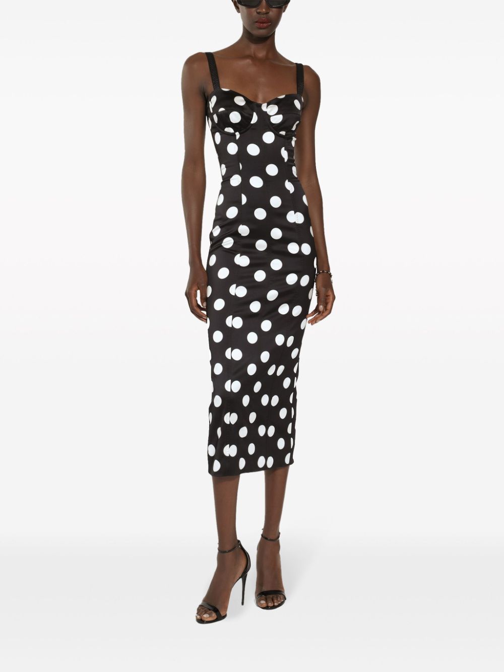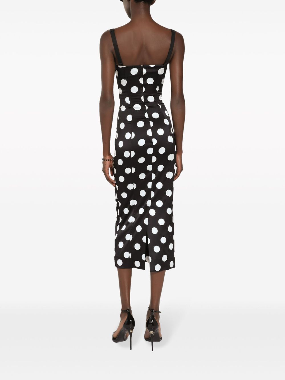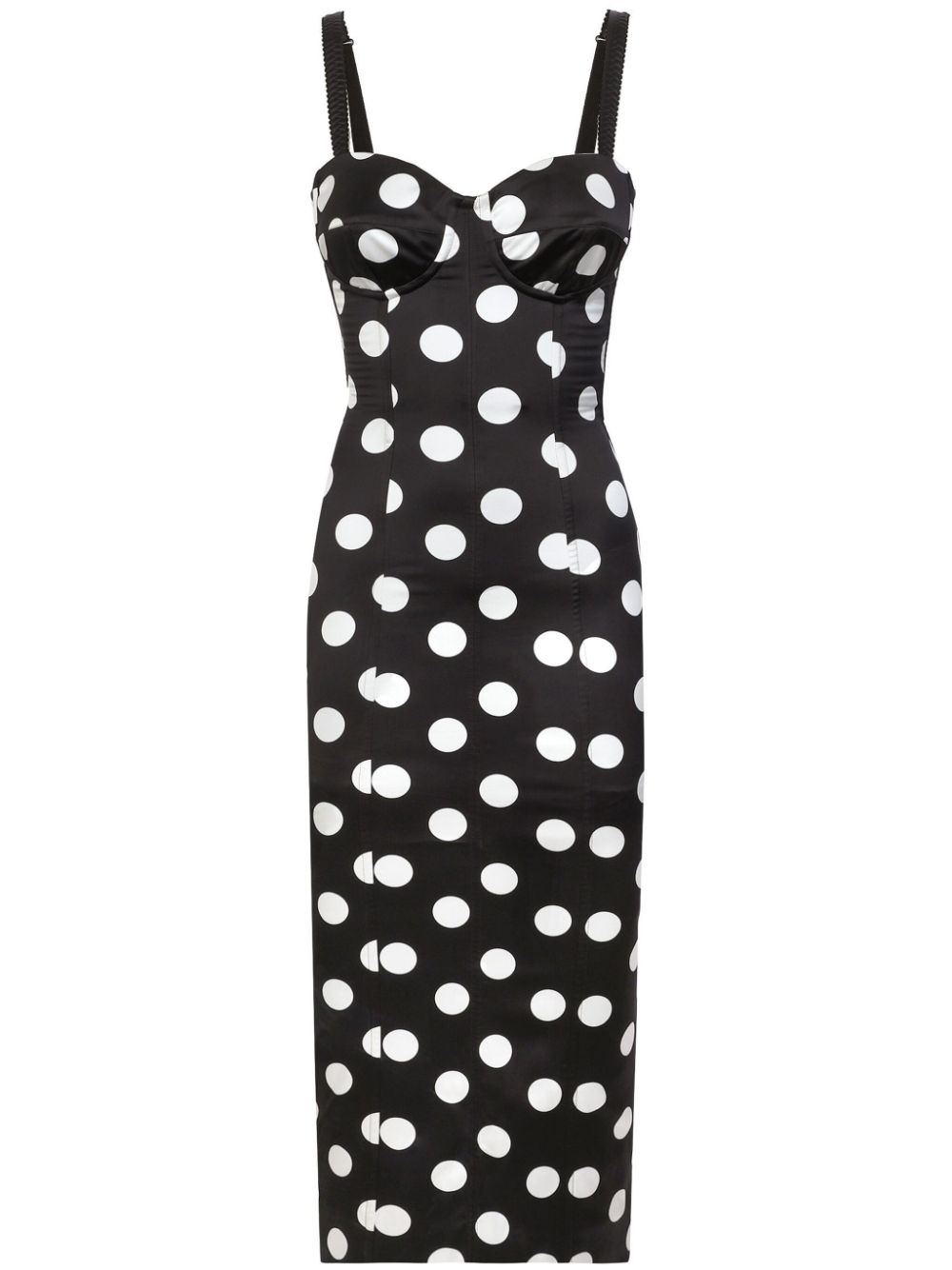 Inspired by Hollywood glamour, this Dolce & Gabbana satin dress is decorated with a bold polka dot print. The garment is designed with an elegant bustier-style neckline before falling to a midi silhouette for a dramatic look.