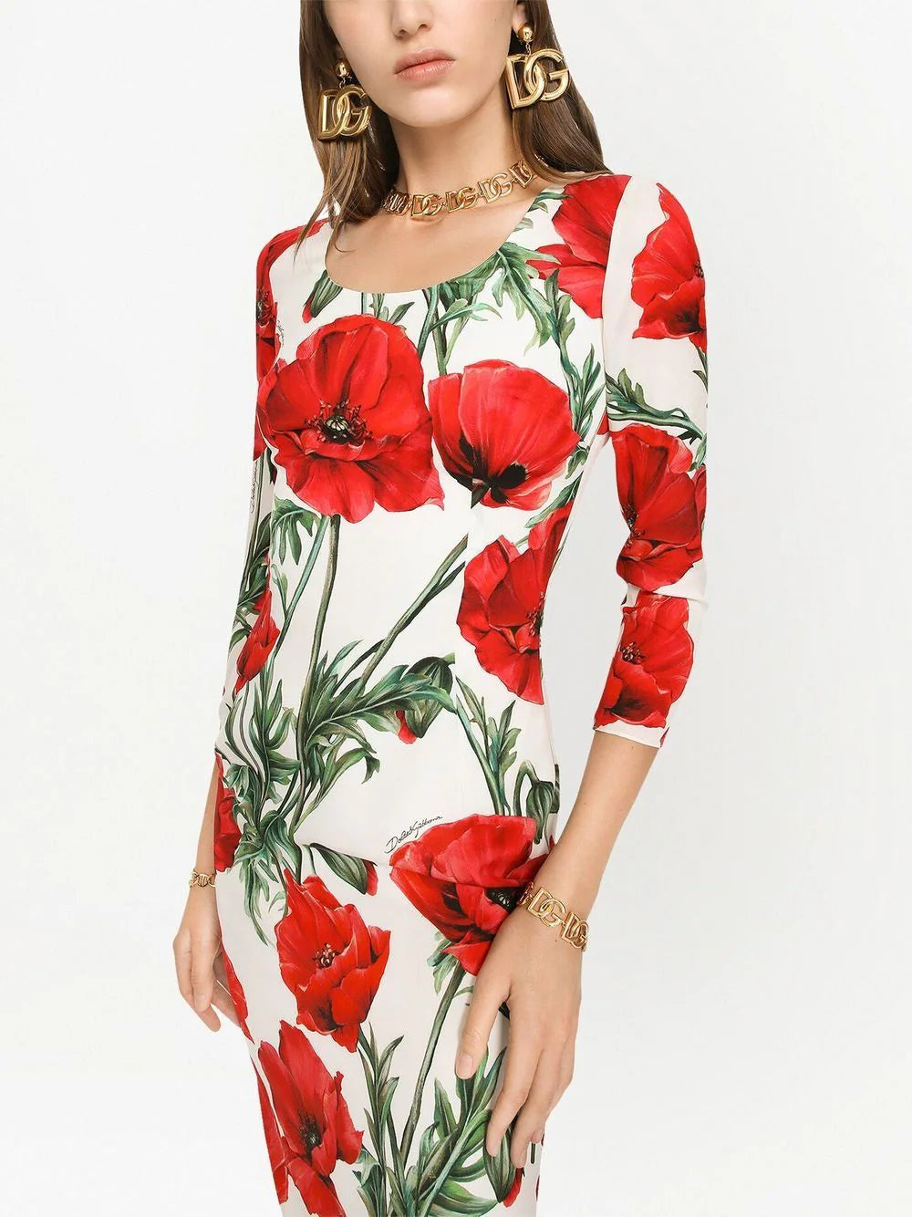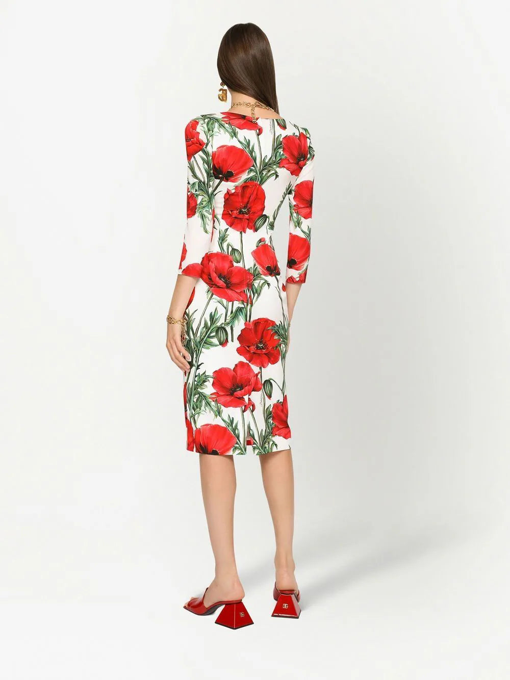 Often used through their collections, the poppy print represents Dolce & Gabbana's striking, ornate aesthetic. Seen in this stretch-design midi dress, the piece is elevated further by the premium silk-blend construction.