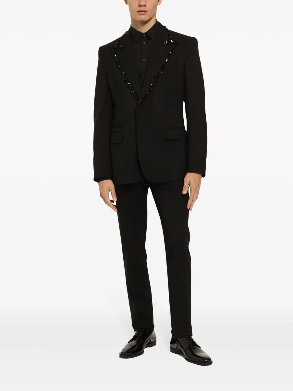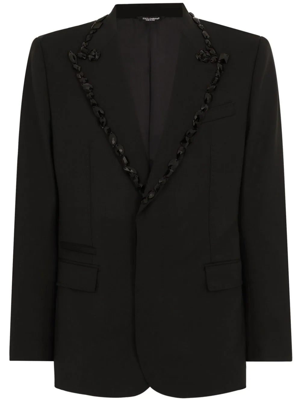 Dolce & Gabbana focuses on elevated tailoring for SS24. This blazer is artfully embellished with black rhinestones on the lapel, showcasing the House's exquisite glamour.