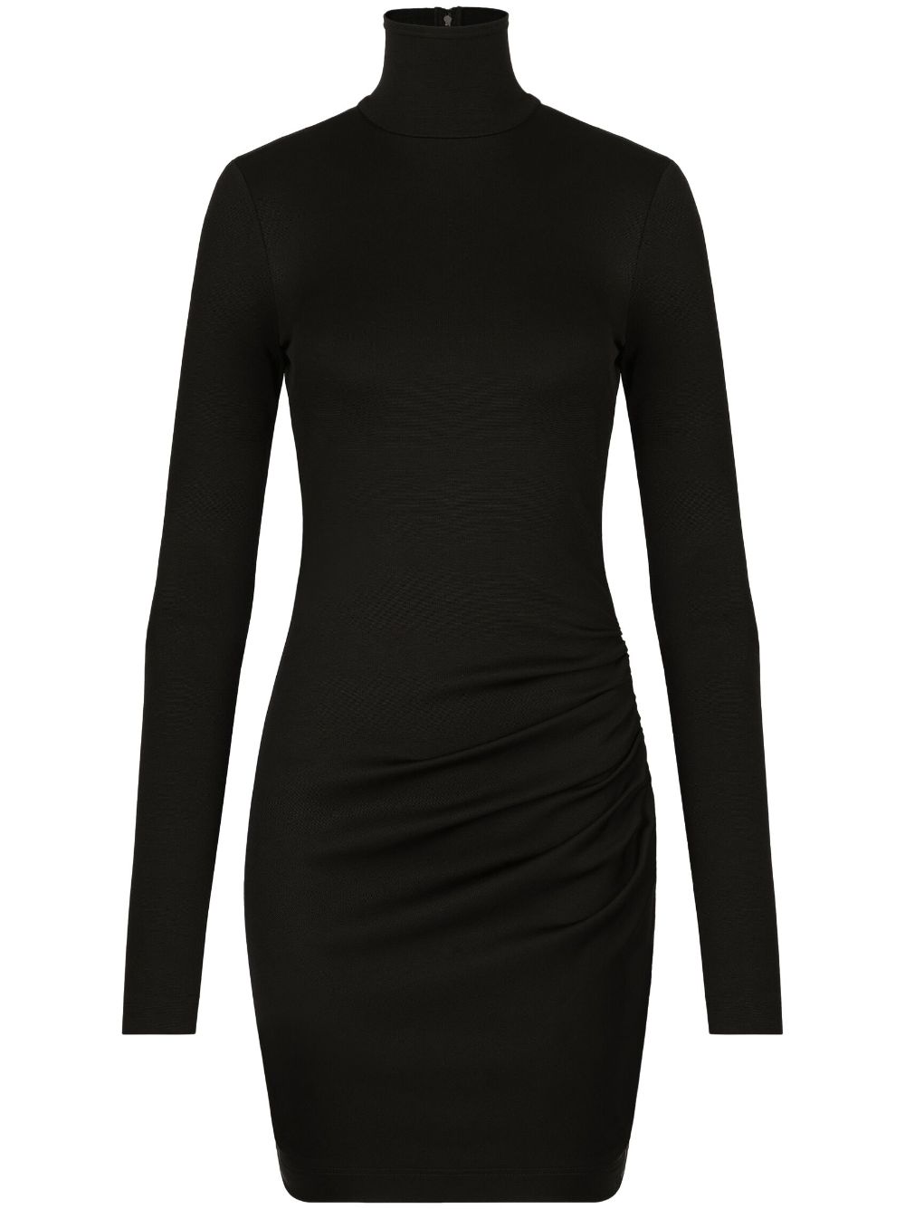 A detour from the maison's habitual brightly patterned designs, this black Dolce&Gabbana minidress is sleek and alluring, boasting a figure-hugging silhouette accentuated by ruching at the left hip.