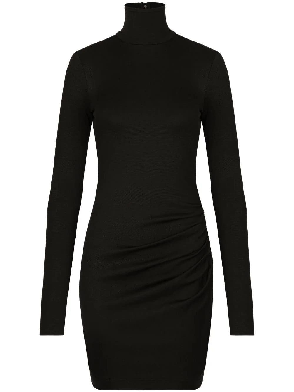 A detour from the maison's habitual brightly patterned designs, this black Dolce&Gabbana minidress is sleek and alluring, boasting a figure-hugging silhouette accentuated by ruching at the left hip.