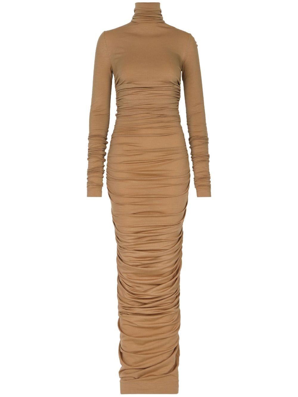 Made from stretchy virgin wool to a high-coverage silhouette that contours the body from neck to ankle, this light-brown Dolce&Gabbana dress is defined by heavy ruching, creating visual and textural contrast.