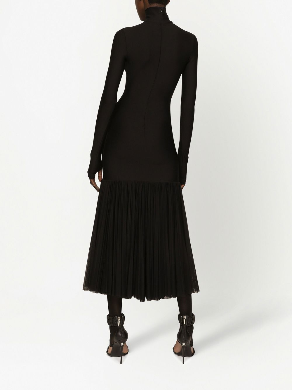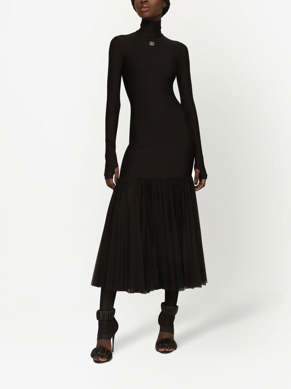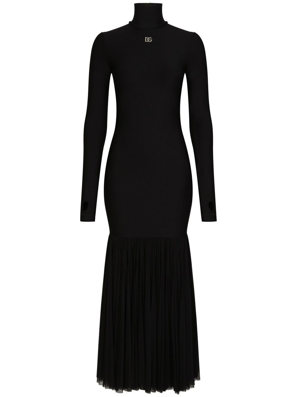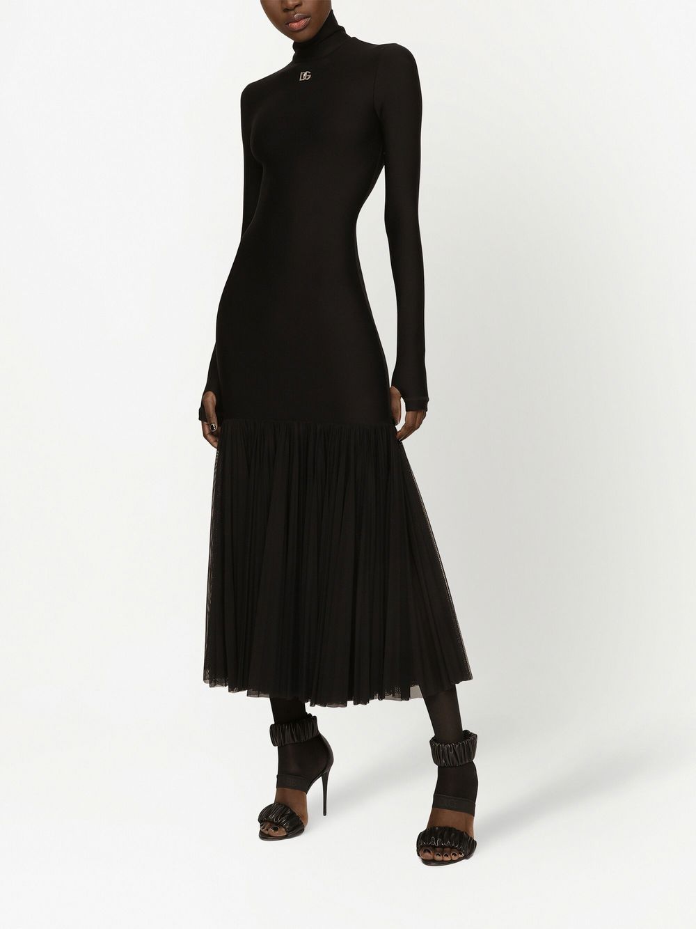 Crafted in a minimalistic black hue, this midi dress from Dolce & Gabbana presents a timeless wardrobe staple with a hint of their typically extravagant vision. Featuring their iconic logo plaque at the chest, the underlying tulle skirt adds a grandiose element to the design.
