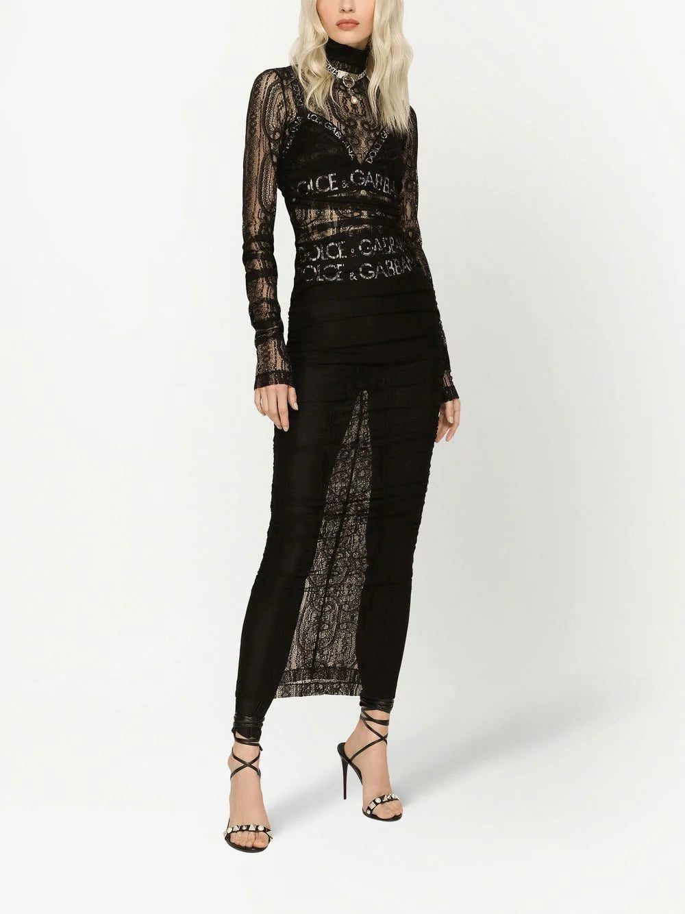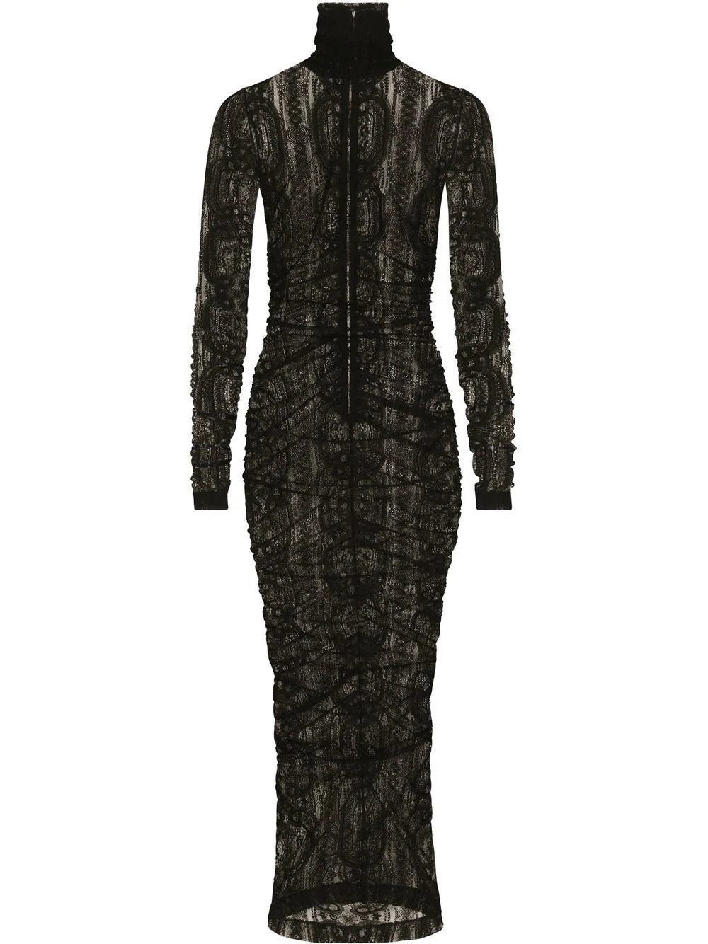 semi-sheer lace roll-neck dress from DOLCE & GABBANA featuring black, lace overlay, semi-sheer construction, roll neck, long sleeves, stretch-design and ankle-length.