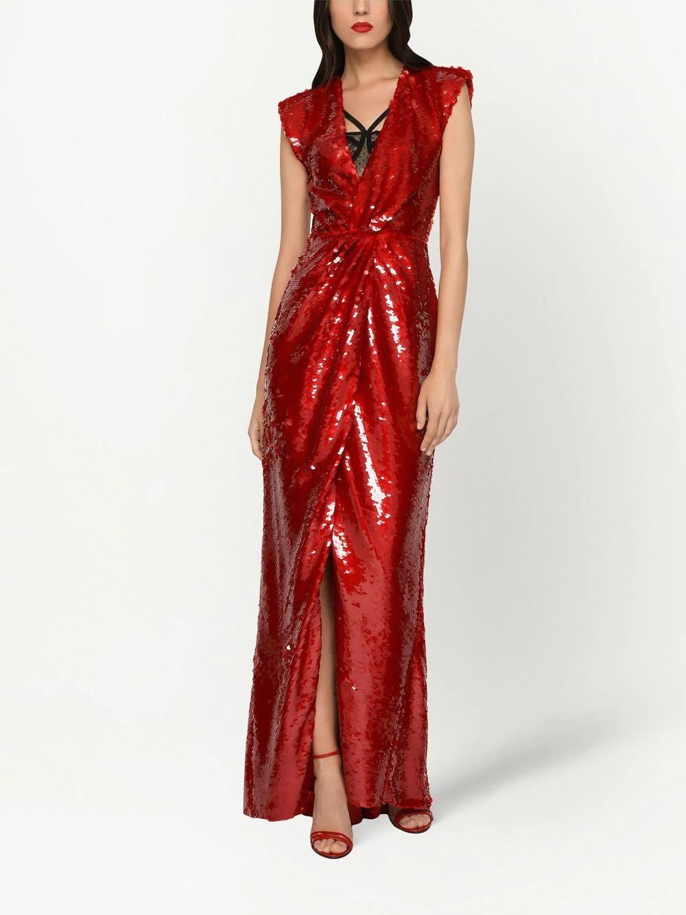 This Dolce & Gabbana gown embodies the brand's glamorous style, sequined all over with dazzling scarlet-red paillettes. Thoughtful detailing elevates the classic silhouette, from the twist detail on the bodice to the draped slit at the front.