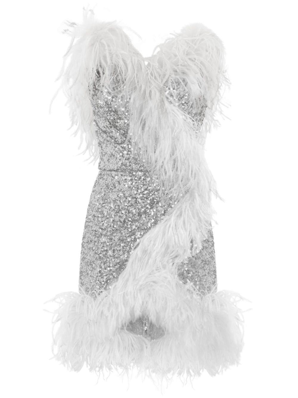Reflecting Dolce & Gabbana's high-octane glamour, this dress is covered in silver light-catching sequins. It's cut to a wrap design trimmed with feathers for a tactile finish.