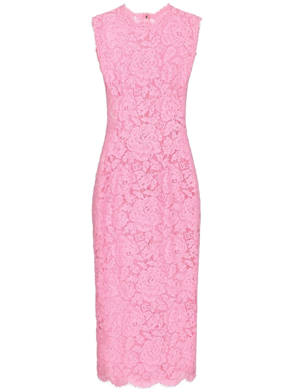 sleeveless lace shift dress from DOLCE & GABBANA featuring light pink, stretch-design, lace trim, semi-sheer construction, round neck, short sleeves, concealed rear zip fastening, scallop hem and mid-length.