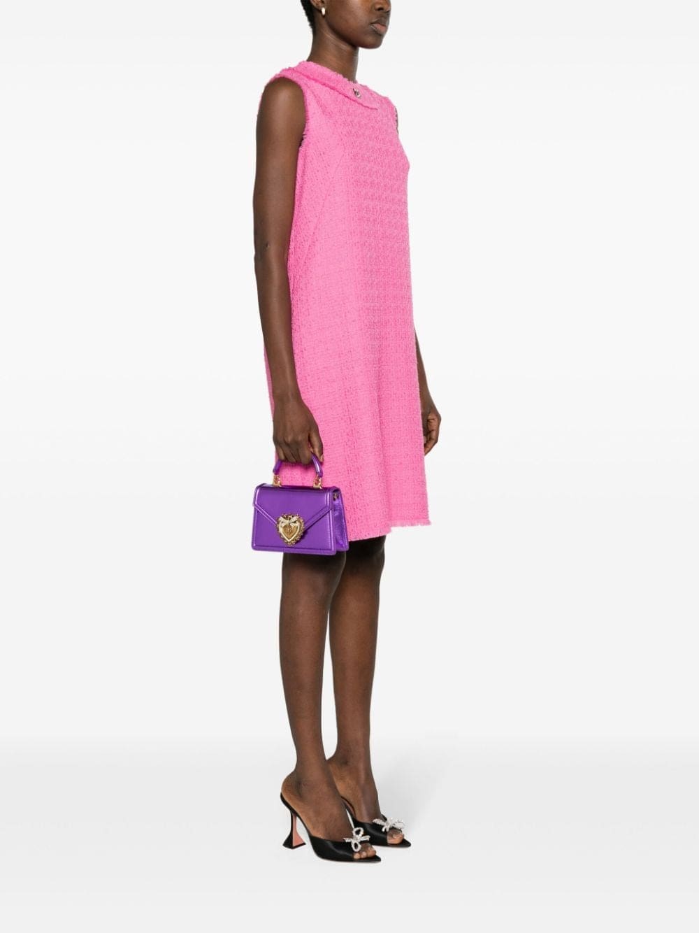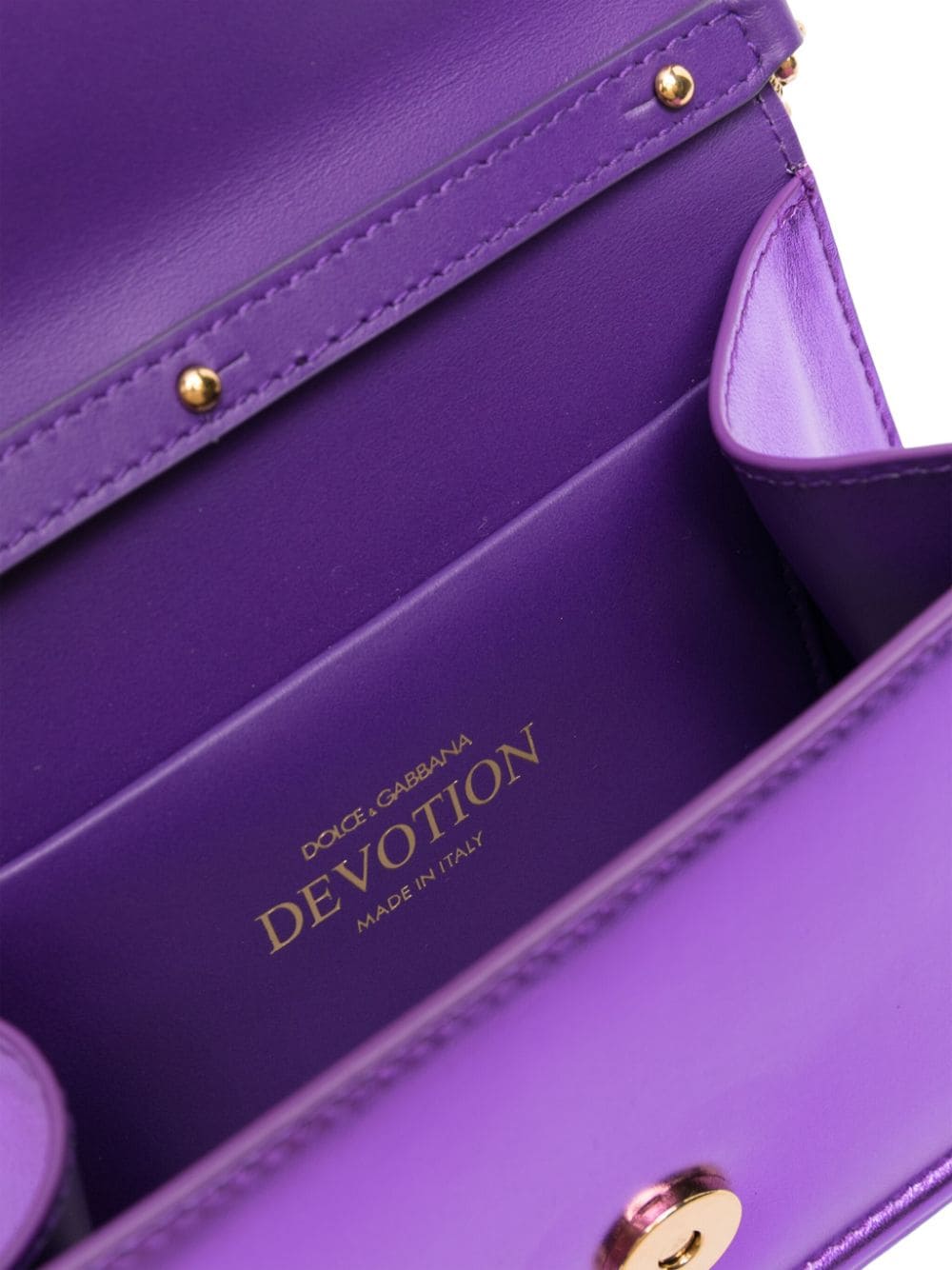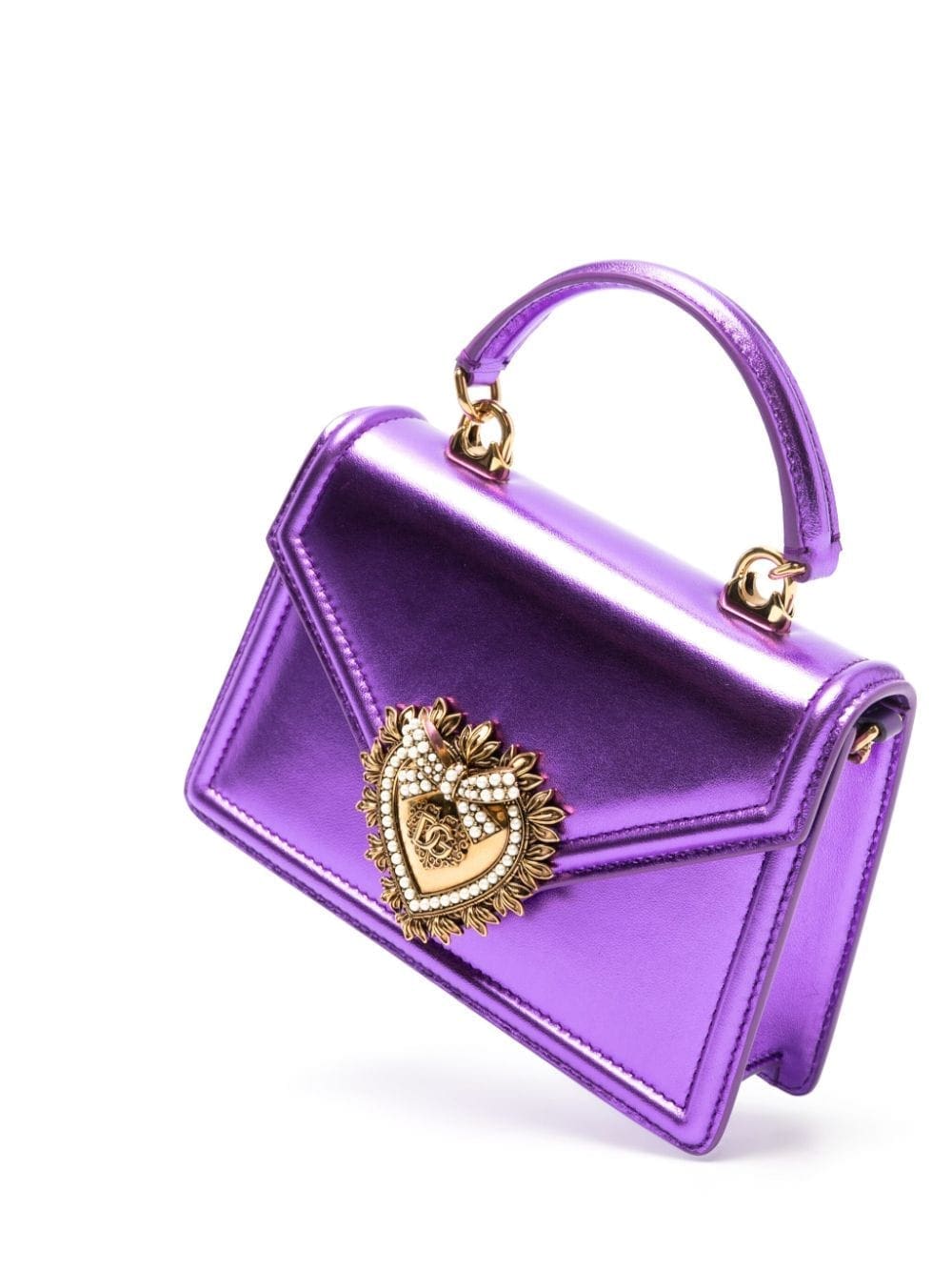 Defined by its signature pearl-adorned heart plaque, Dolce & Gabbana's Devotion tote bag is reimagined in metallic purple lambskin for SS24. The compact trapezoid silhouette is designed to be carried by hand with its top handle or worn crossbody thanks to the detachable chain-link shoulder strap.