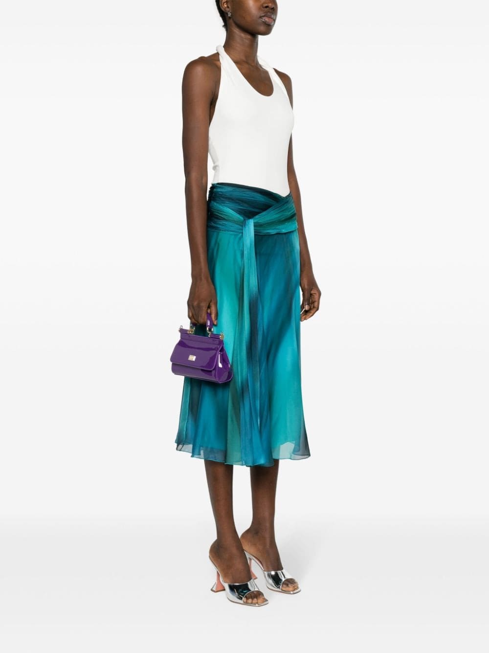 A Dolce & Gabbana icon, the Sicily bag stands out in its timeless simplicity. The structured silhouette appears here in its small iteration, which is slightly more elongated than its original counterpart. It is crafted in Italy from patent calf leather, and presented in a bold shade of violet purple.