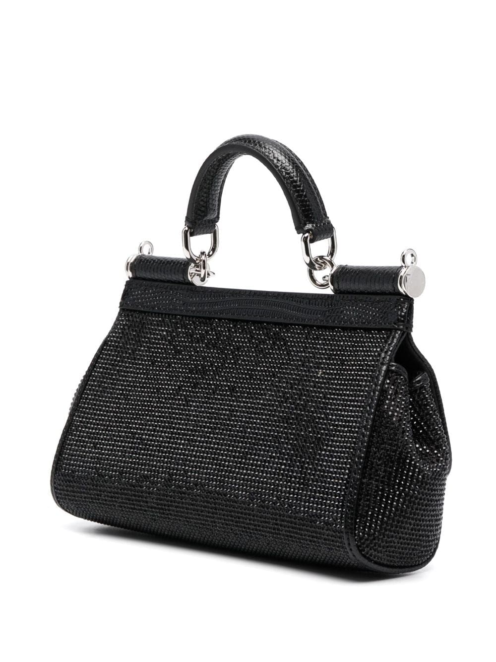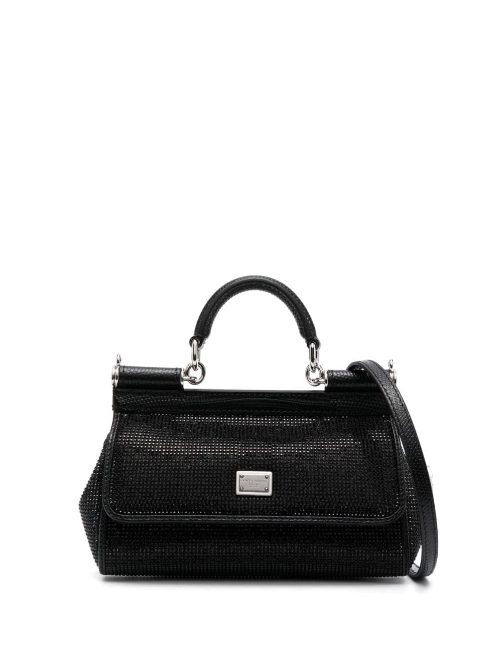This small Sicily shoulder bag is a high-octane take on the iconic model first released in 2009. Retaining classic elements such as the single top handle and palladium-plated metal logo plaque, it’s reimagined with a satin and leather construction saturated with scores of rhinestones.