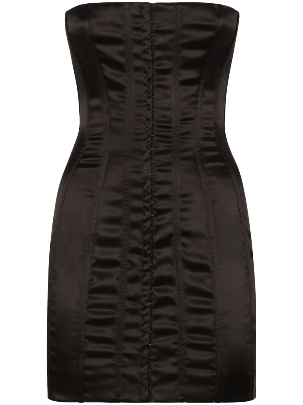 Lingerie-inspired elements are often used by Dolce & Gabbana to showcase its glamorous style. A testament to that, this black dress is crafted from satin with front hook-and-eye fastening reminiscent of corsets.