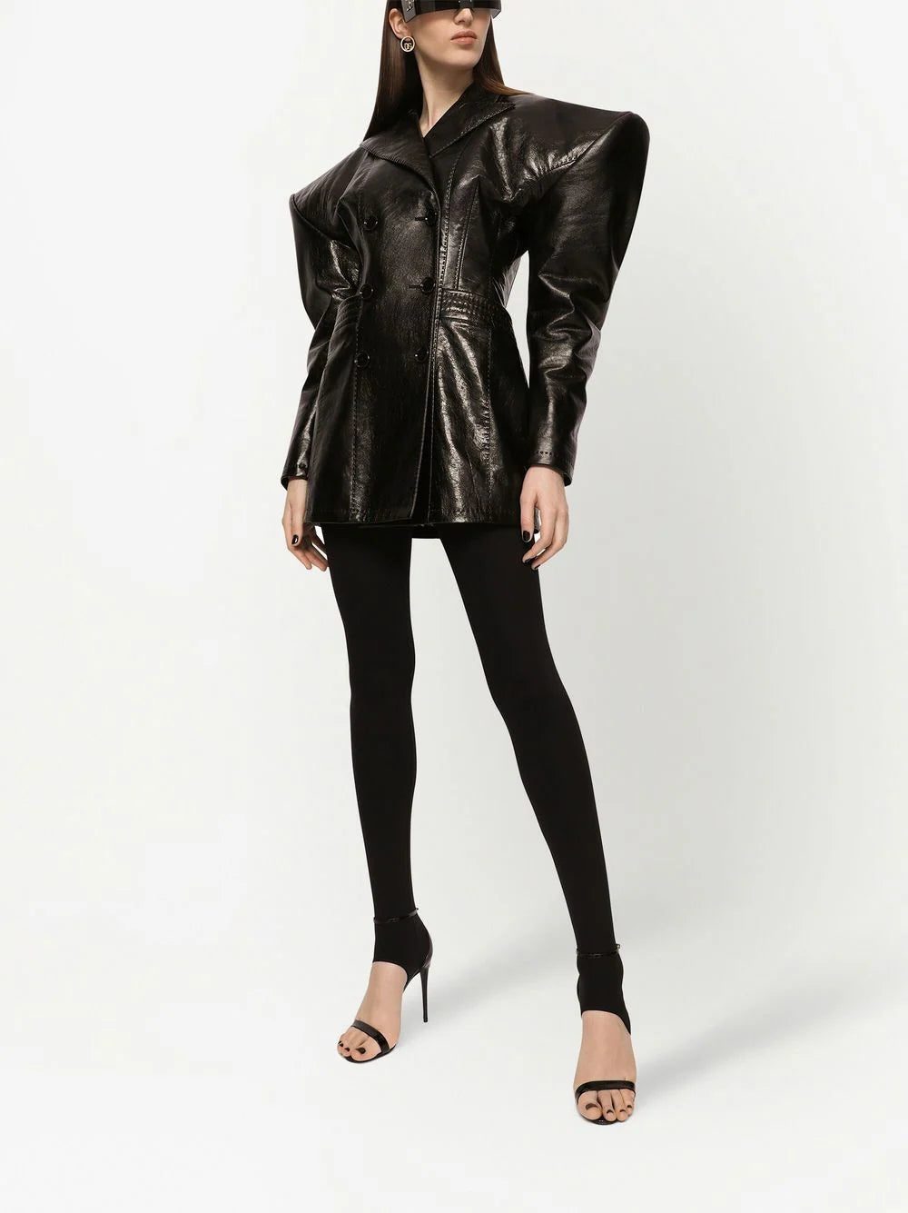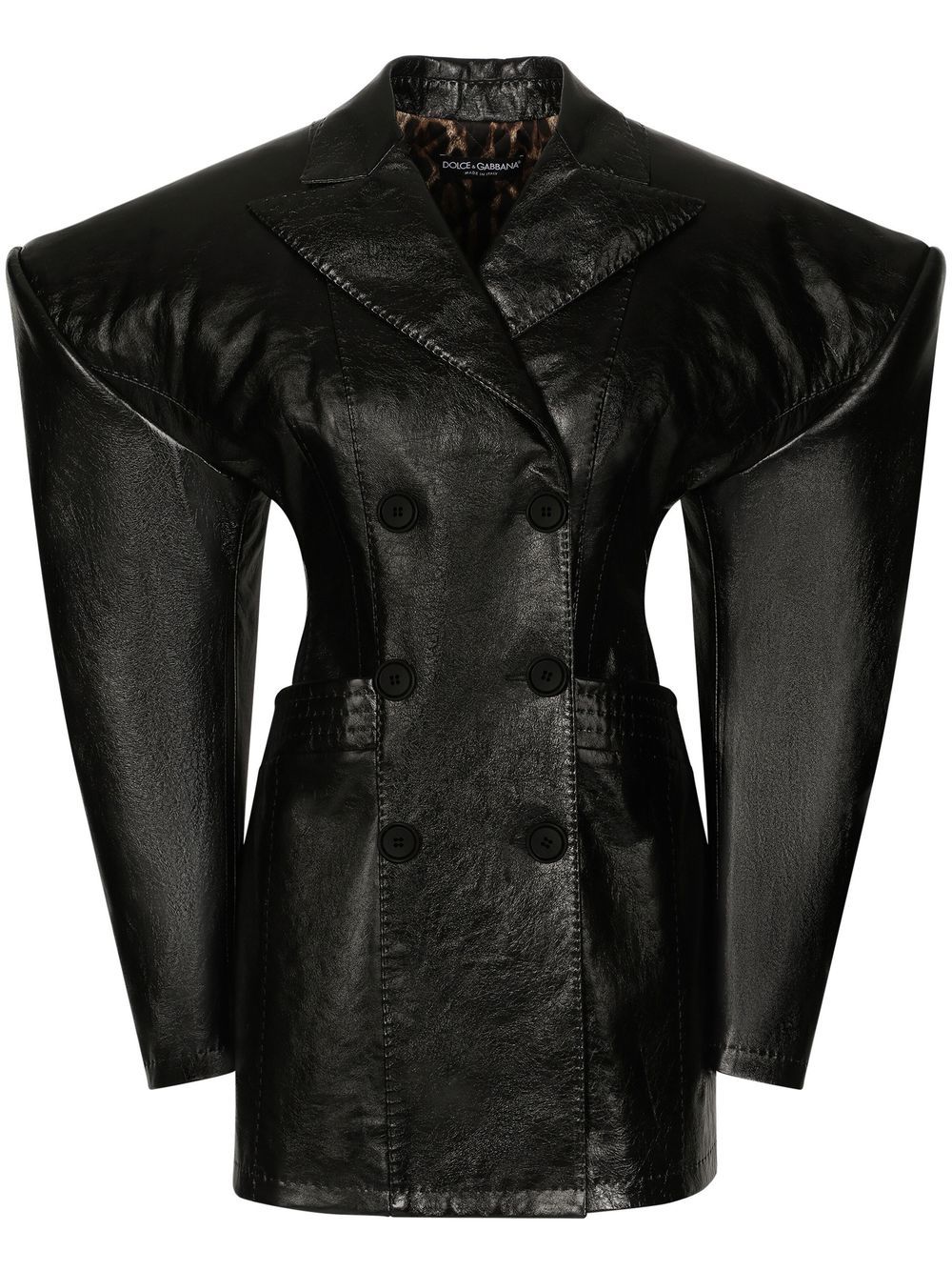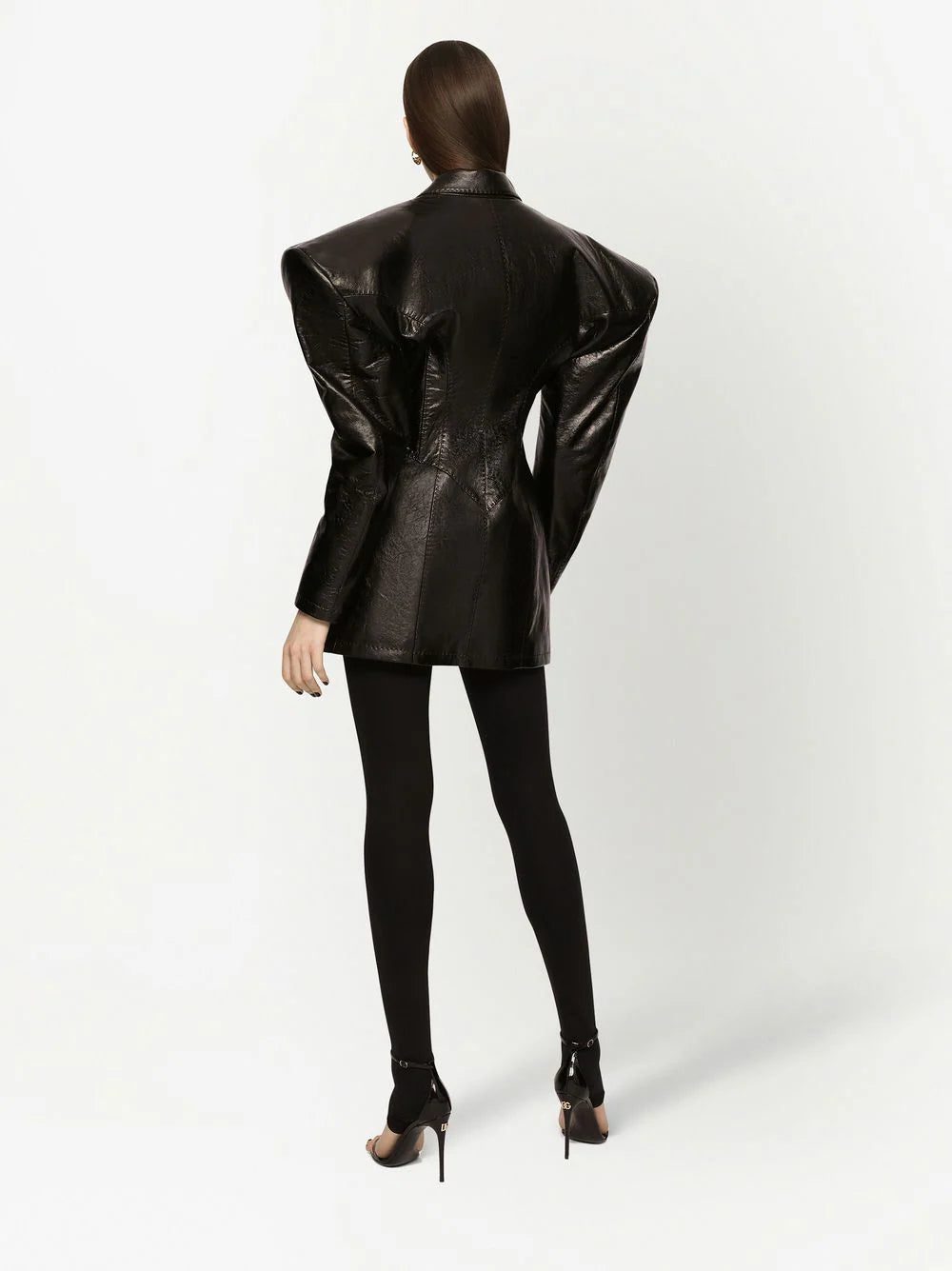 Dolce & Gabbana presents a futuristic vision of its signature aesthetic in the AW22 collection. People transform into heroines of a video game by wearing pieces, such as this leather jacket, that features geometric volume and shoulder pads, that reinforces the style and uniqueness.