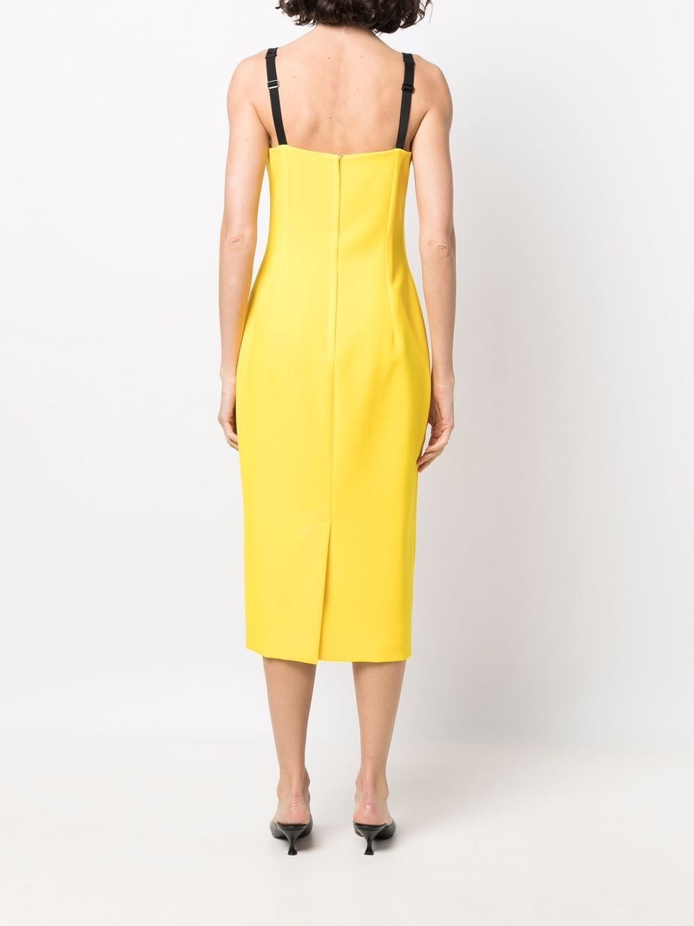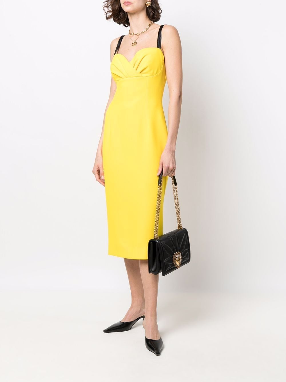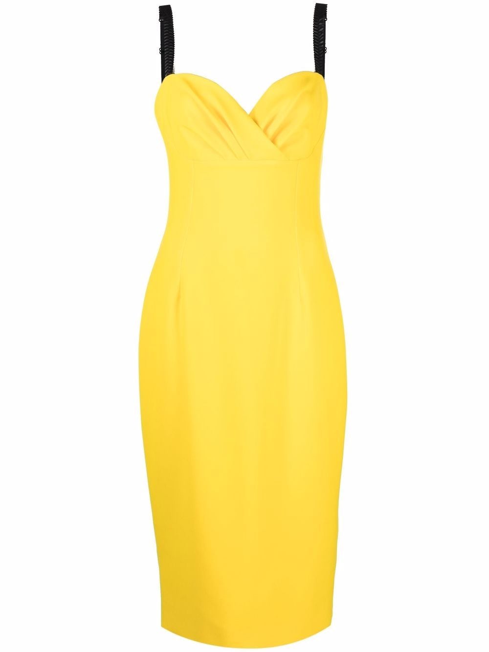 yellow/black silk-blend gathered detailing sweetheart neck rear zip fastening fitted waistline adjustable shoulder straps mid-calf length