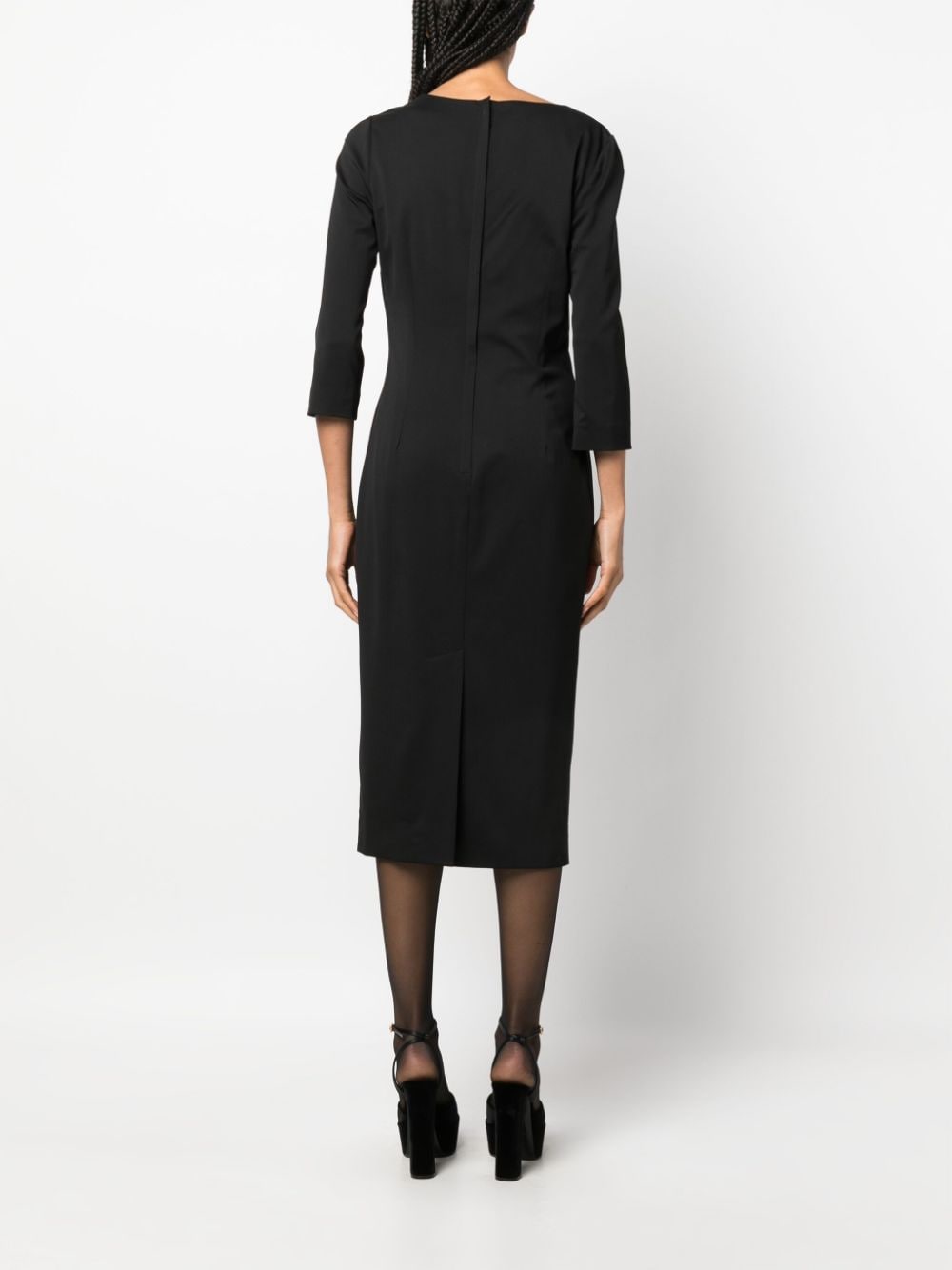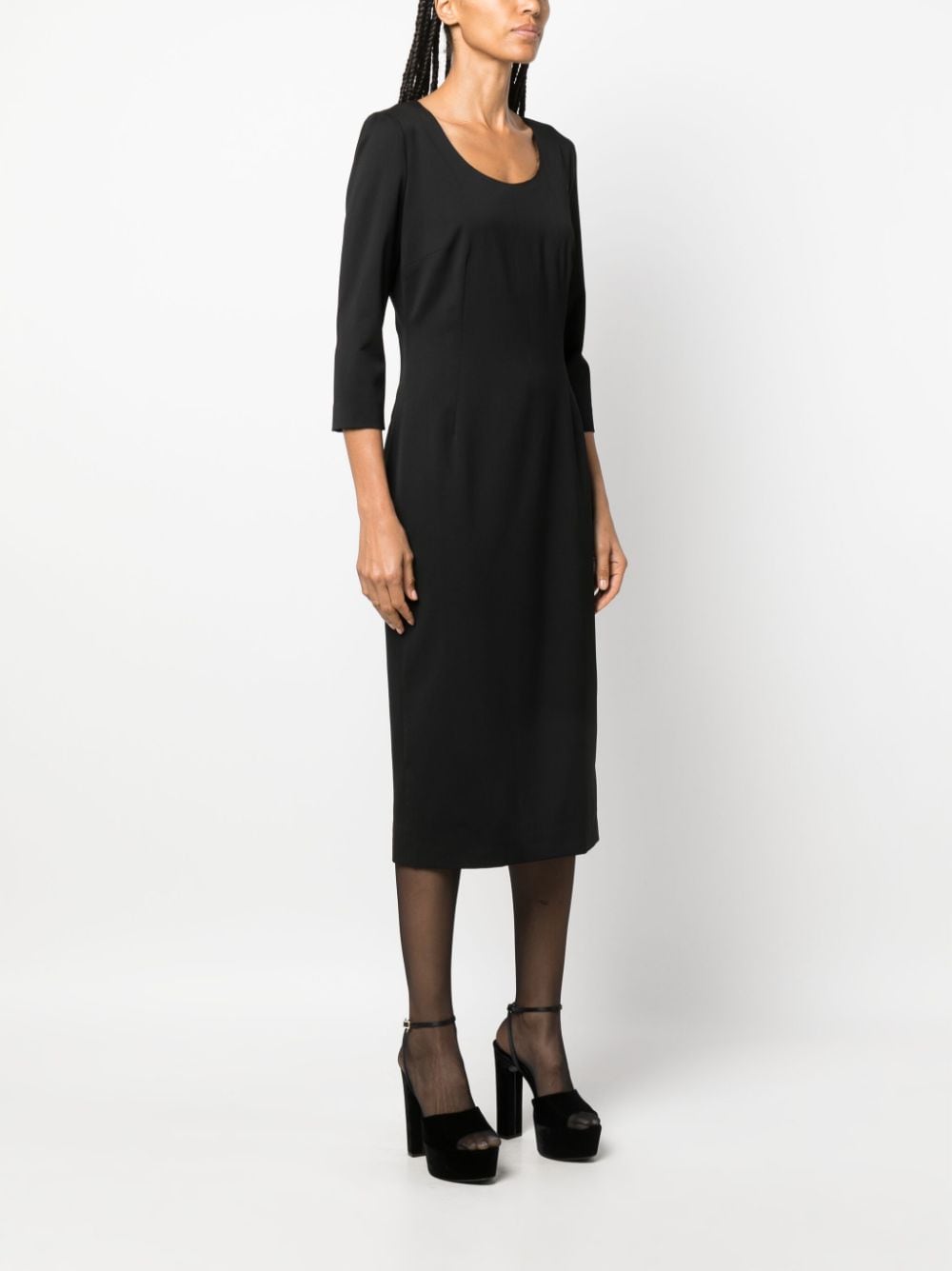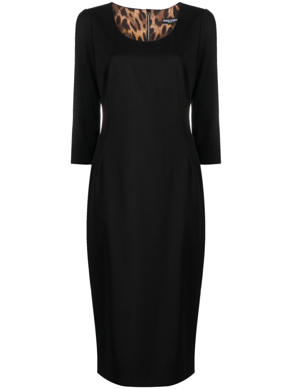 Dolce & Gabbana takes on a minimalist approach with this black midi dress. Made from stretch virgin wool, it boasts a slim silhouette that delicately accentuates the figure, while the leopard-print lining adds a touch of signature drama.