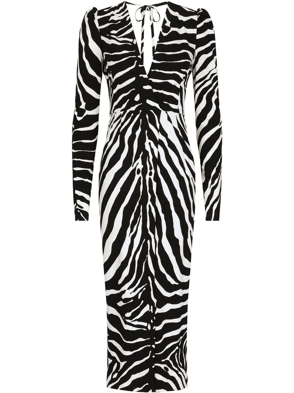 zebra-print long-sleeve dress from DOLCE & GABBANA featuring black, white, silk, zebra print, V-neck, long sleeves and open back.