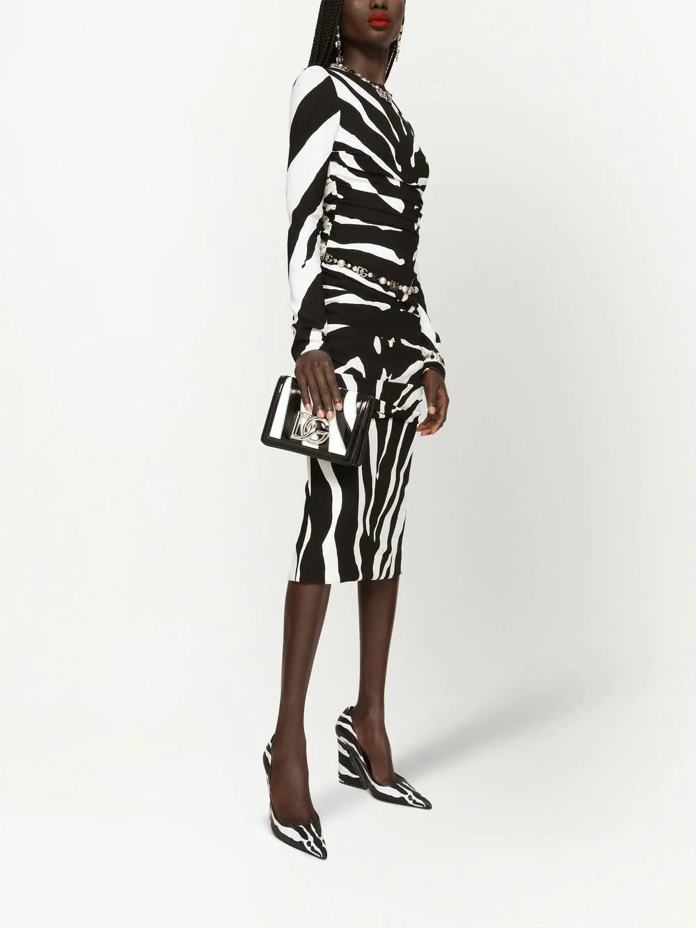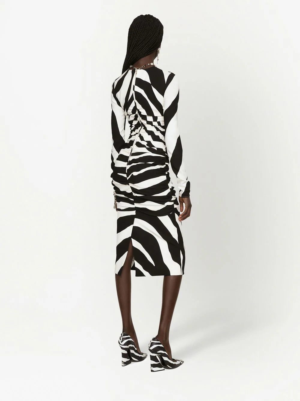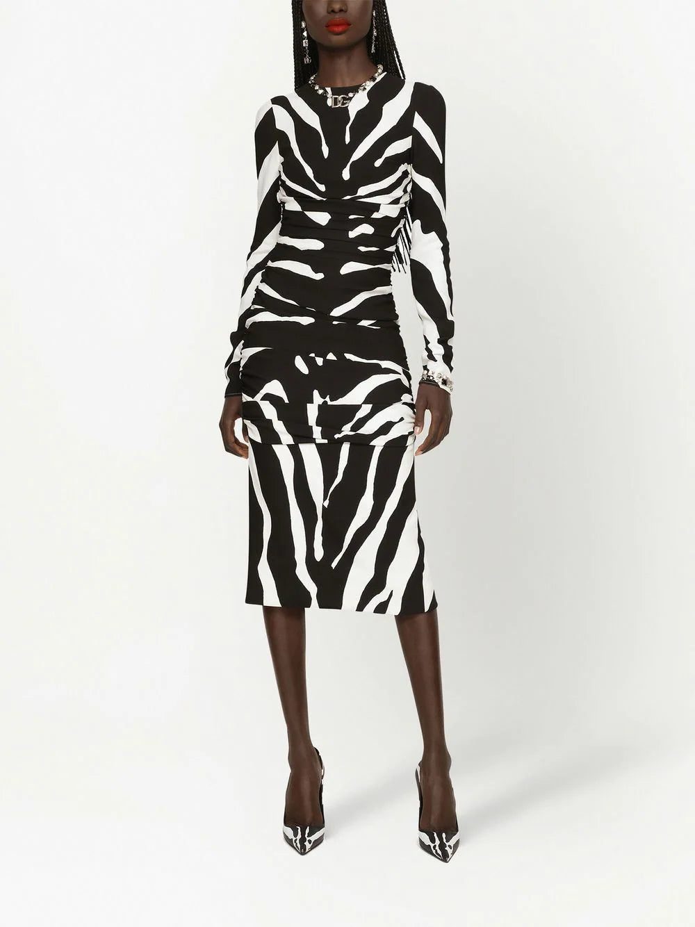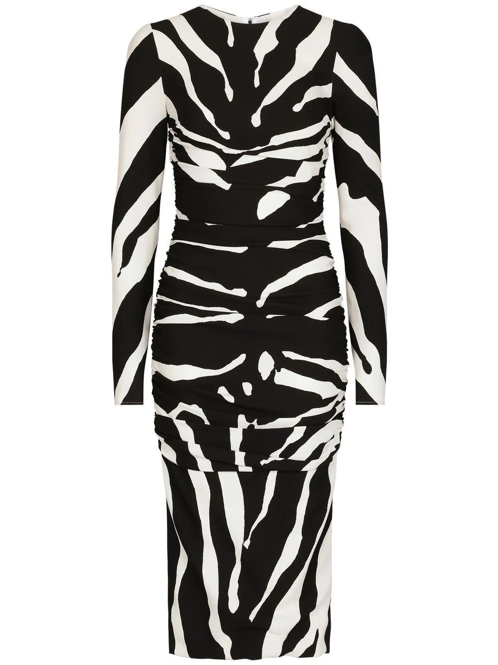 Dolce & Gabbana's signature bold approach to opulence is showcased in this long-sleeve dress from the AW22 collection through an all-over zebra print. Alongside gathered detailing, this eye-catching effect is enhanced.
