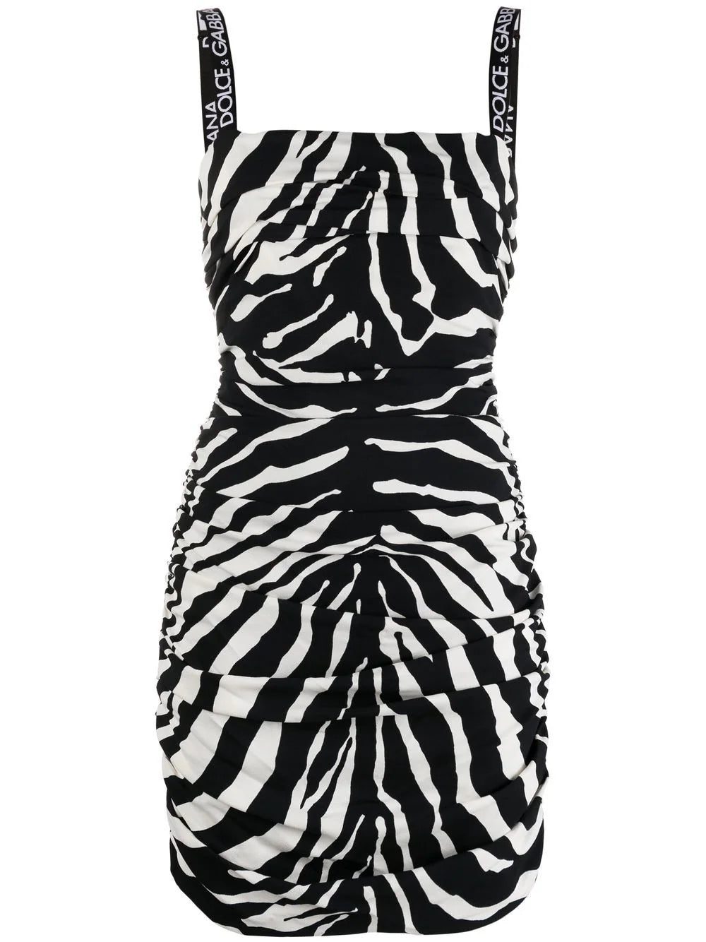 zebra-print silk mini dress from DOLCE & GABBANA featuring black/white, stretch-silk, zebra print, square neck, thin shoulder straps, logo shoulder strap and ruched detailing.