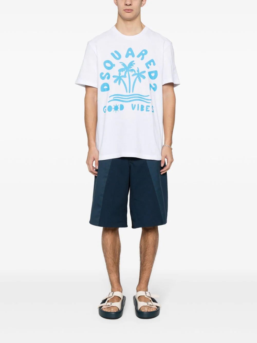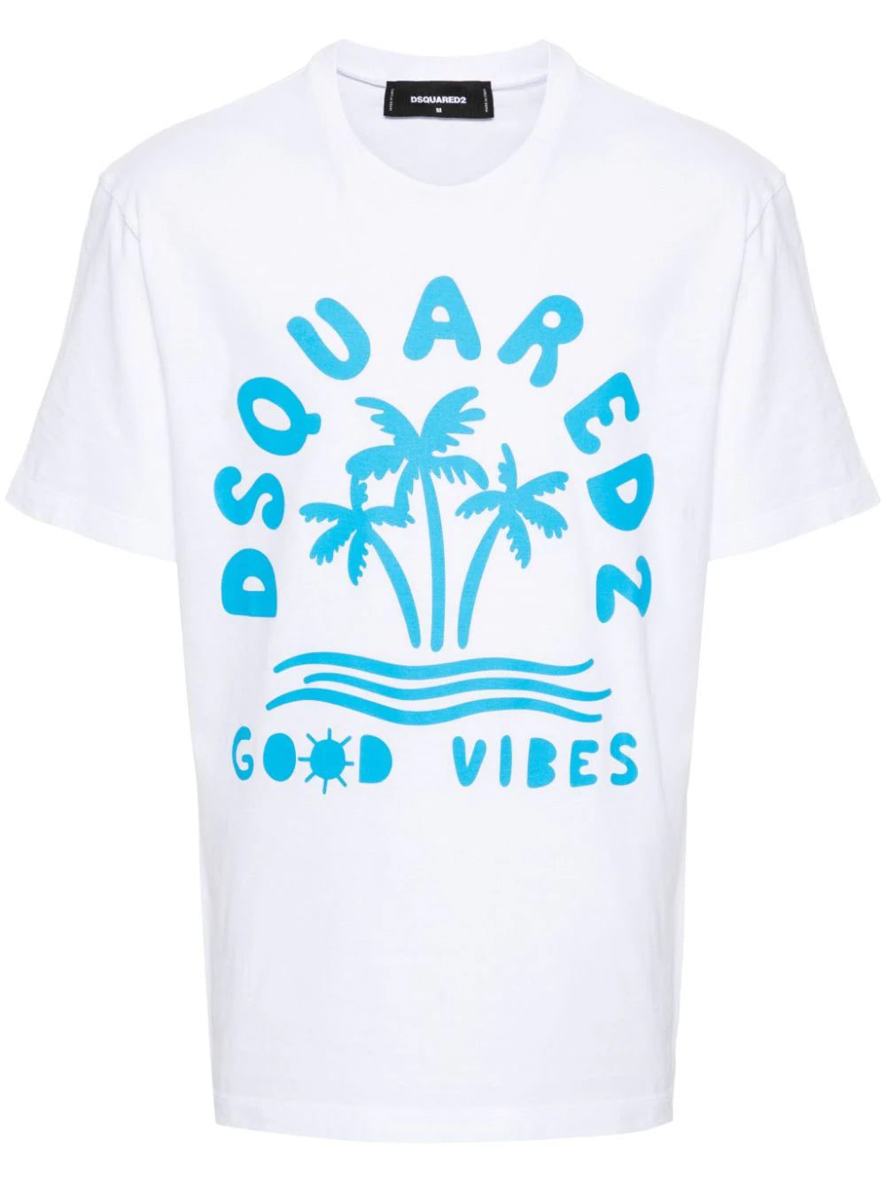 Capturing a laid-back aesthetic, this Dsquared2 T-shirt showcases a whimsical logo print adorned with palm trees and a 'Good Vibes' message. It's crafted from a white cotton jersey and boasts a regular fit.