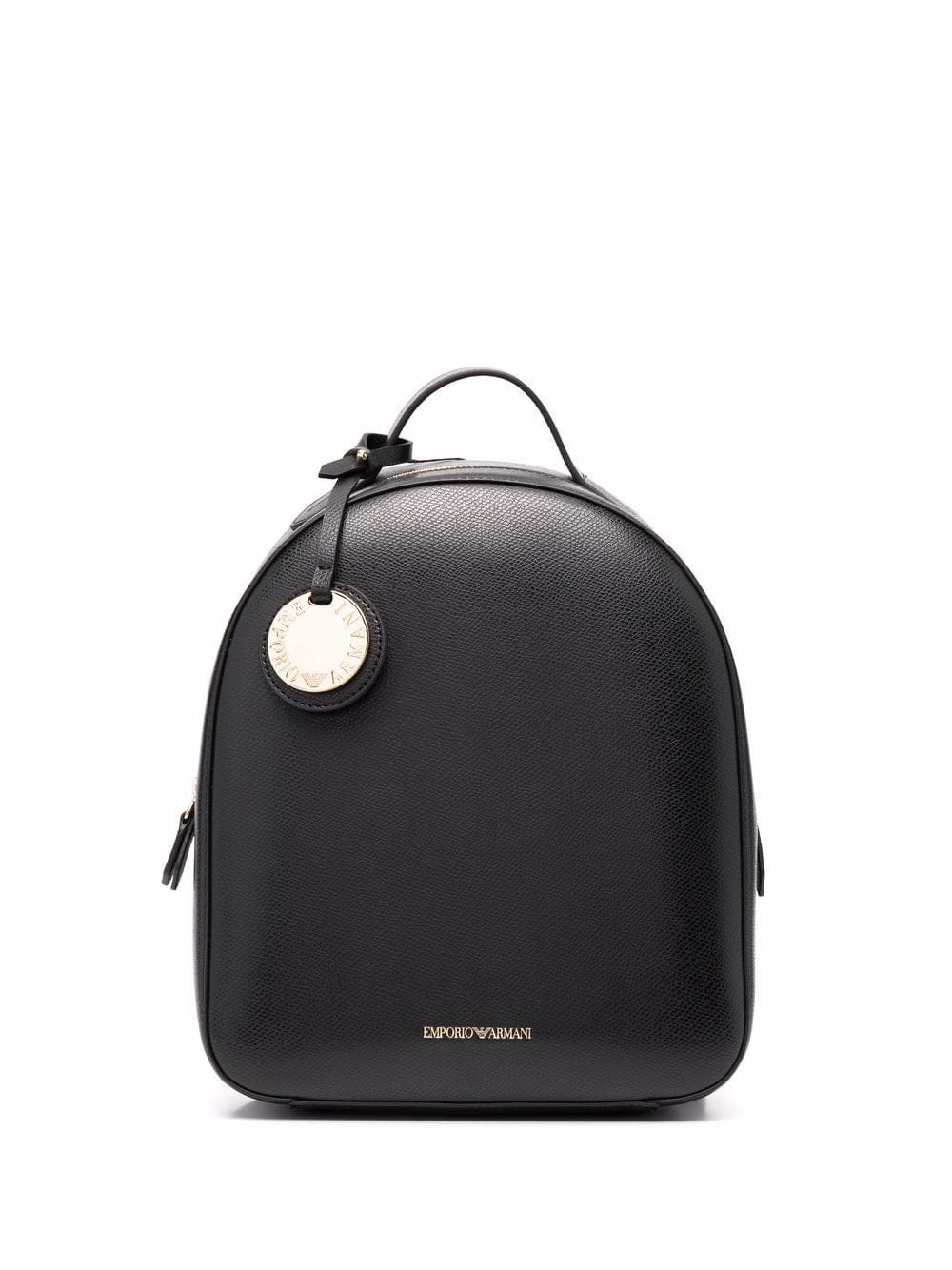 Emporio Armani takes a minimal approach to this classic backpack design, crafted from black pebbled-grain faux-leather. Branded through the sleek gold-tone stamp to the front, the detachable logo-disc detail adds charm to the piece.