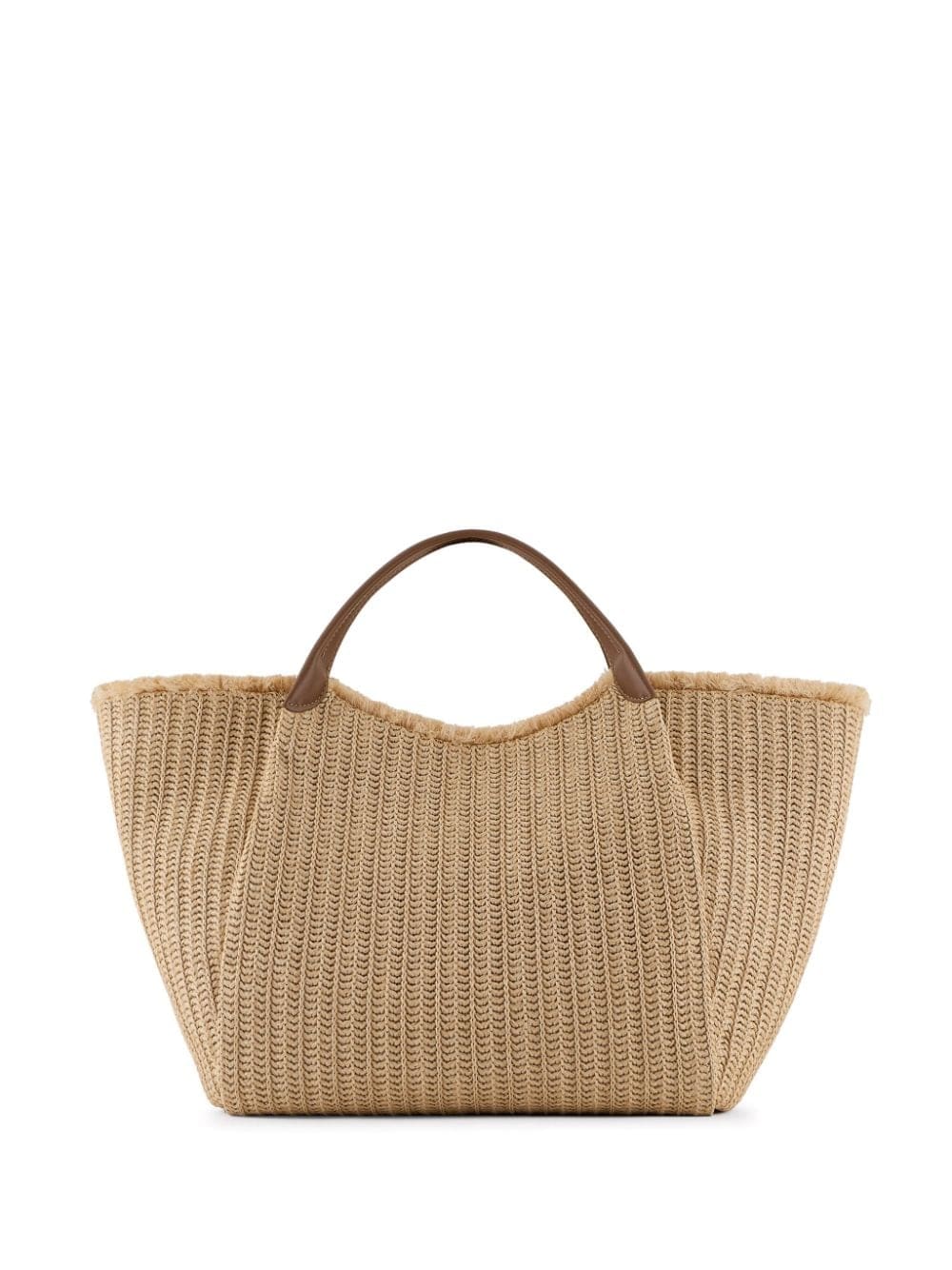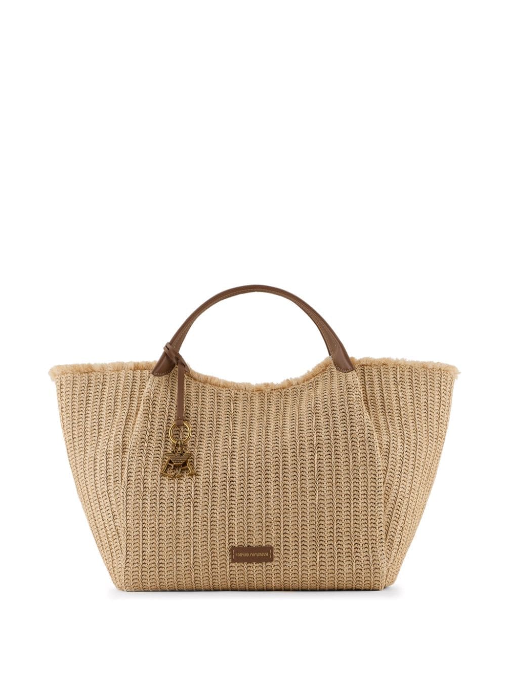 Emporio Armani's logo takes the focus of this tote bag - appearing in a form of a logo charm. The detail appears in a bronze tone, contrasting with the rest of is beige straw construction.