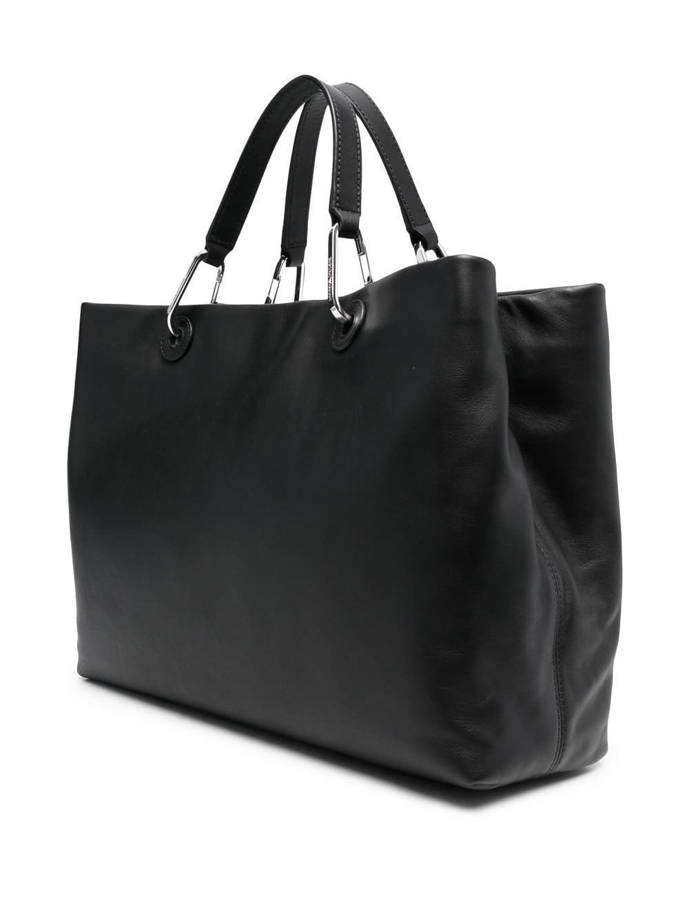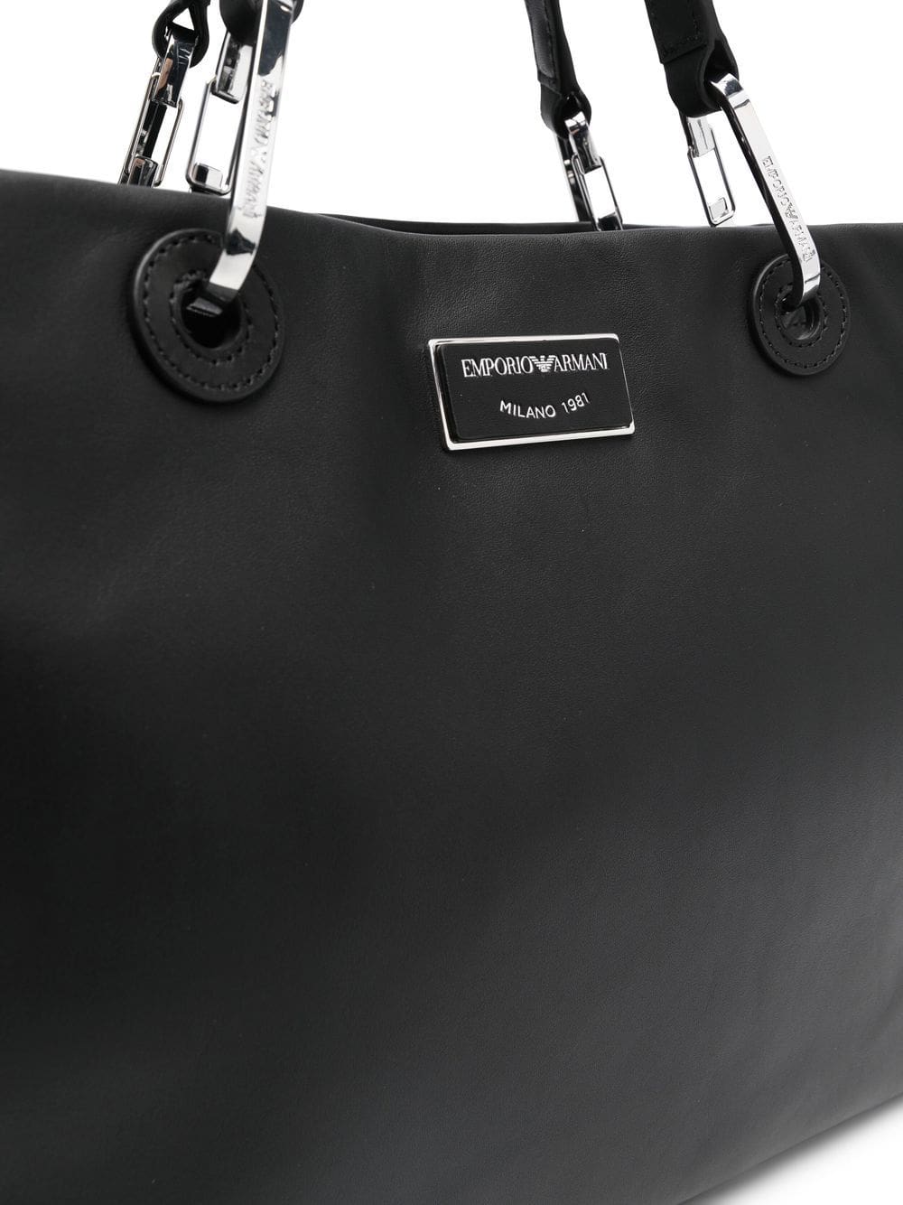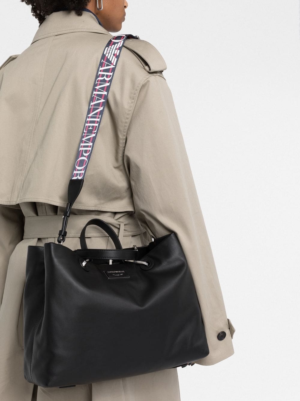 Arriving in a classic tote design, this Emporio Armani bag is crafted from black calf leather and minimally accented with a tonal logo plaque on the front.