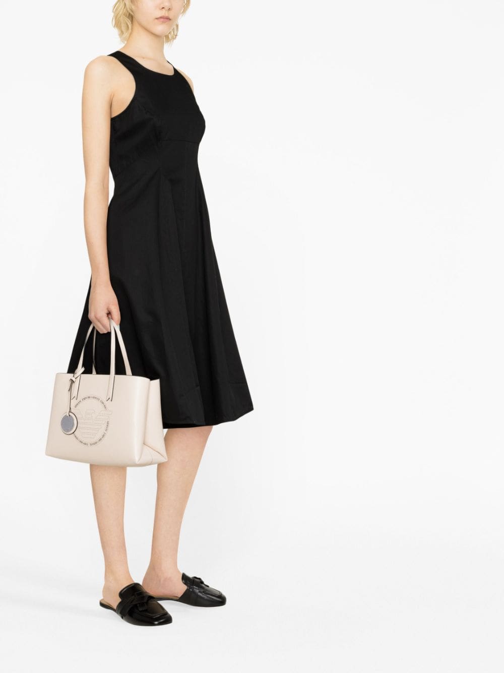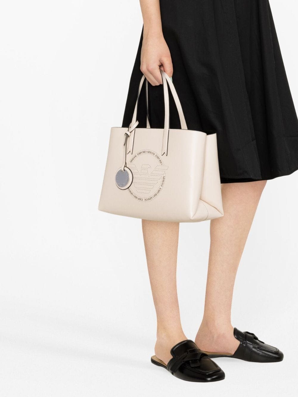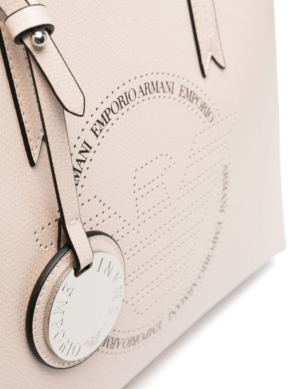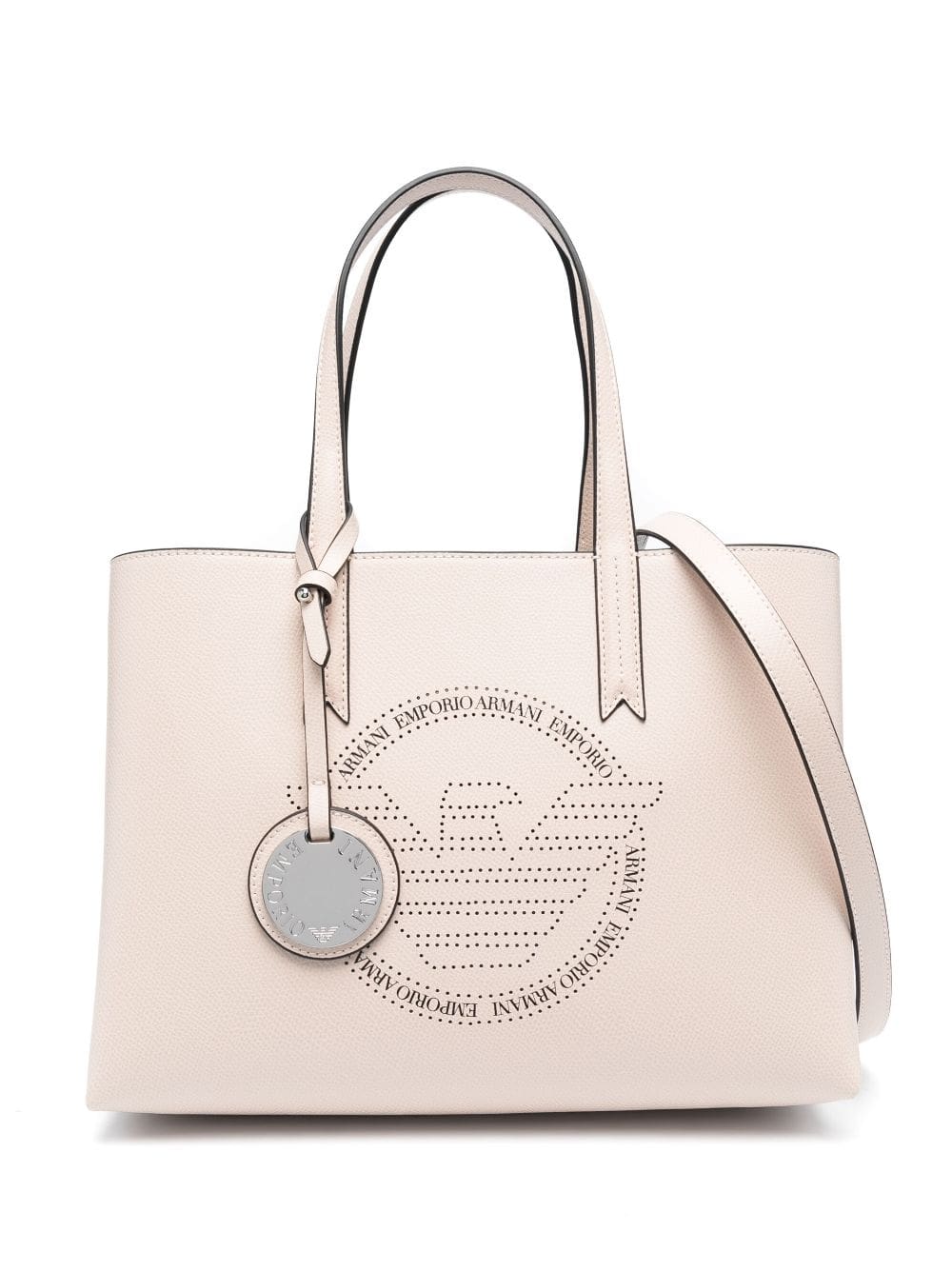 This tote bag from Emporio Armani showcases the brand's propensity for clean lines and streamlined design. It's crafted to a structured shape and detailed with a perforated logo at the front. A silver-tone medallion bearing the house moniker adds an additional branded touch.