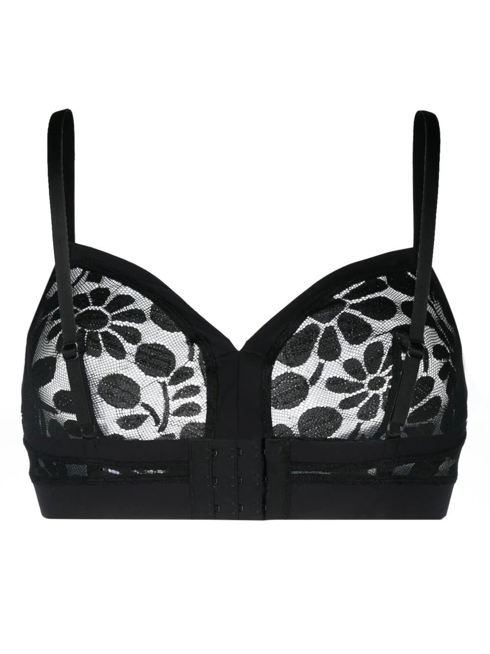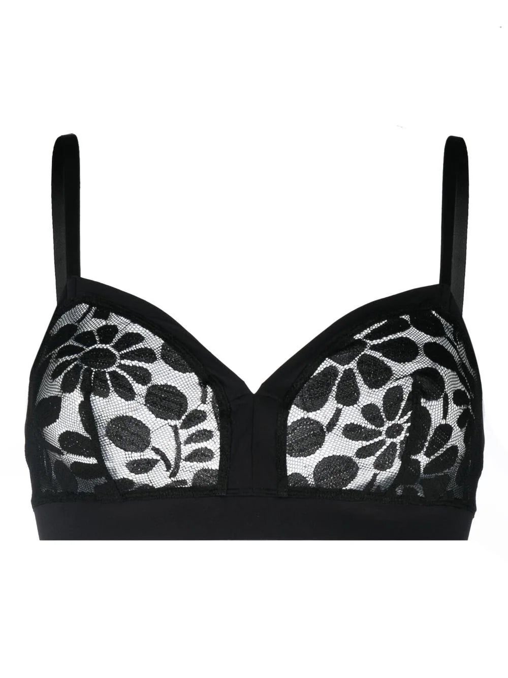 Enhanced with floral lace in an oil black hue, this ERES bra is complete with a stretch design and a wireless construction for additional comfort.