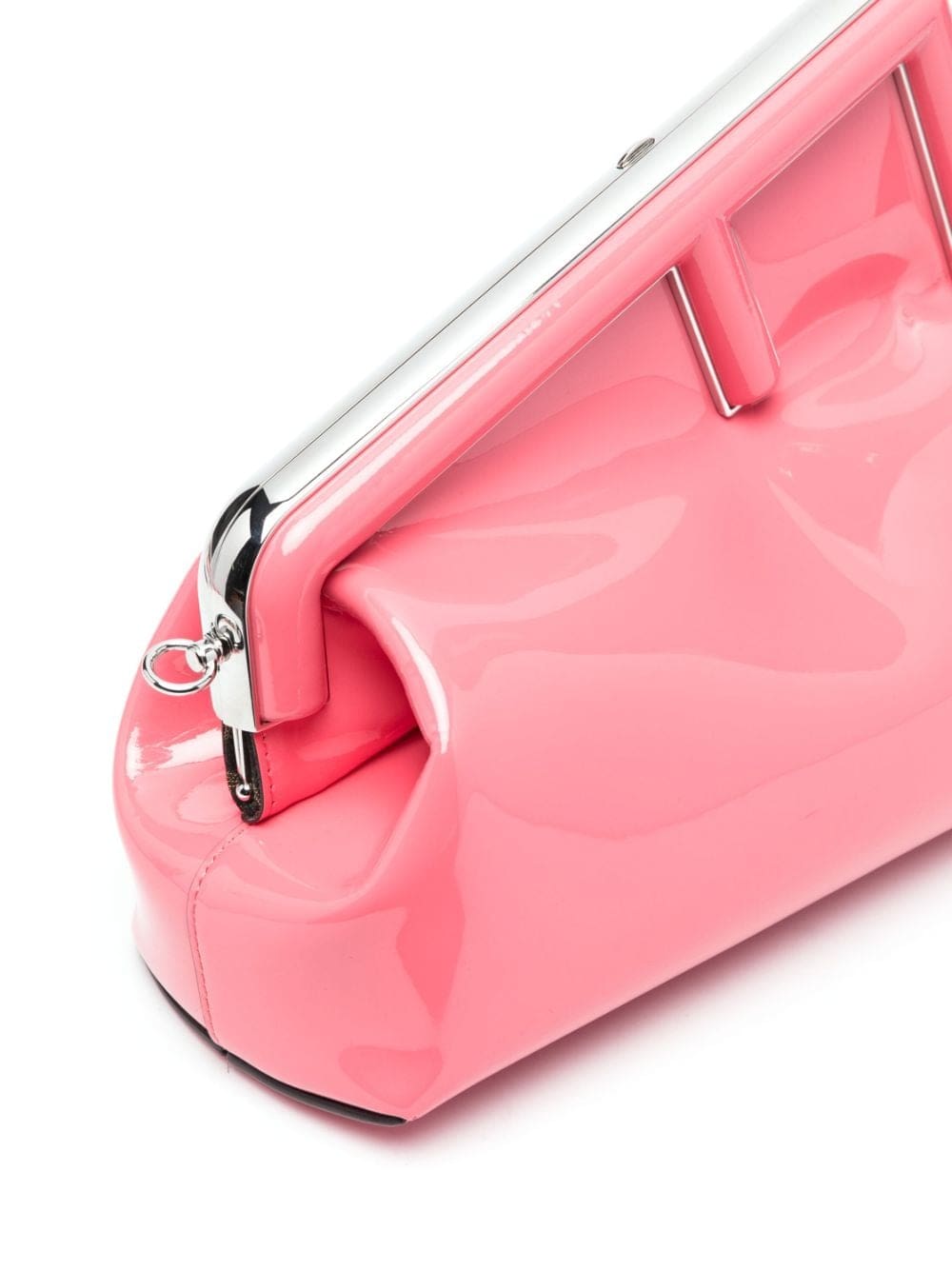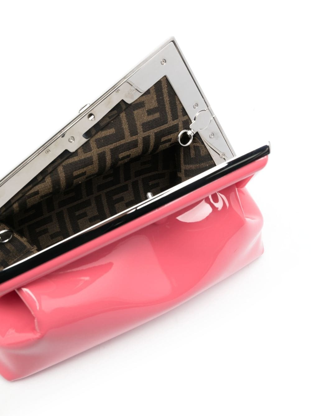 The Italian house introduces the Fendi First bag for SS23. Recognisable by its metal F clasp, this midi version comes in an eye-catching pink patent leather design.